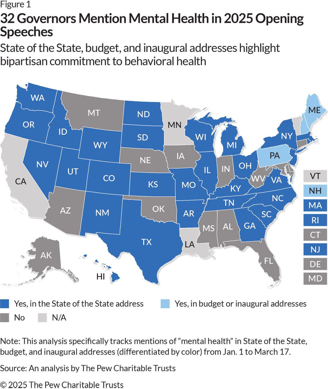 Across the country, governors continue to make behavioral health a priority—using their State of the State, budget, and inaugural addresses to highlight investments in behavioral health infrastructure, workforce, and treatment. According to an analysis by The Pew Charitable Trusts, 32 governors referenced mental health in speeches addressing their constituencies in early 2025.