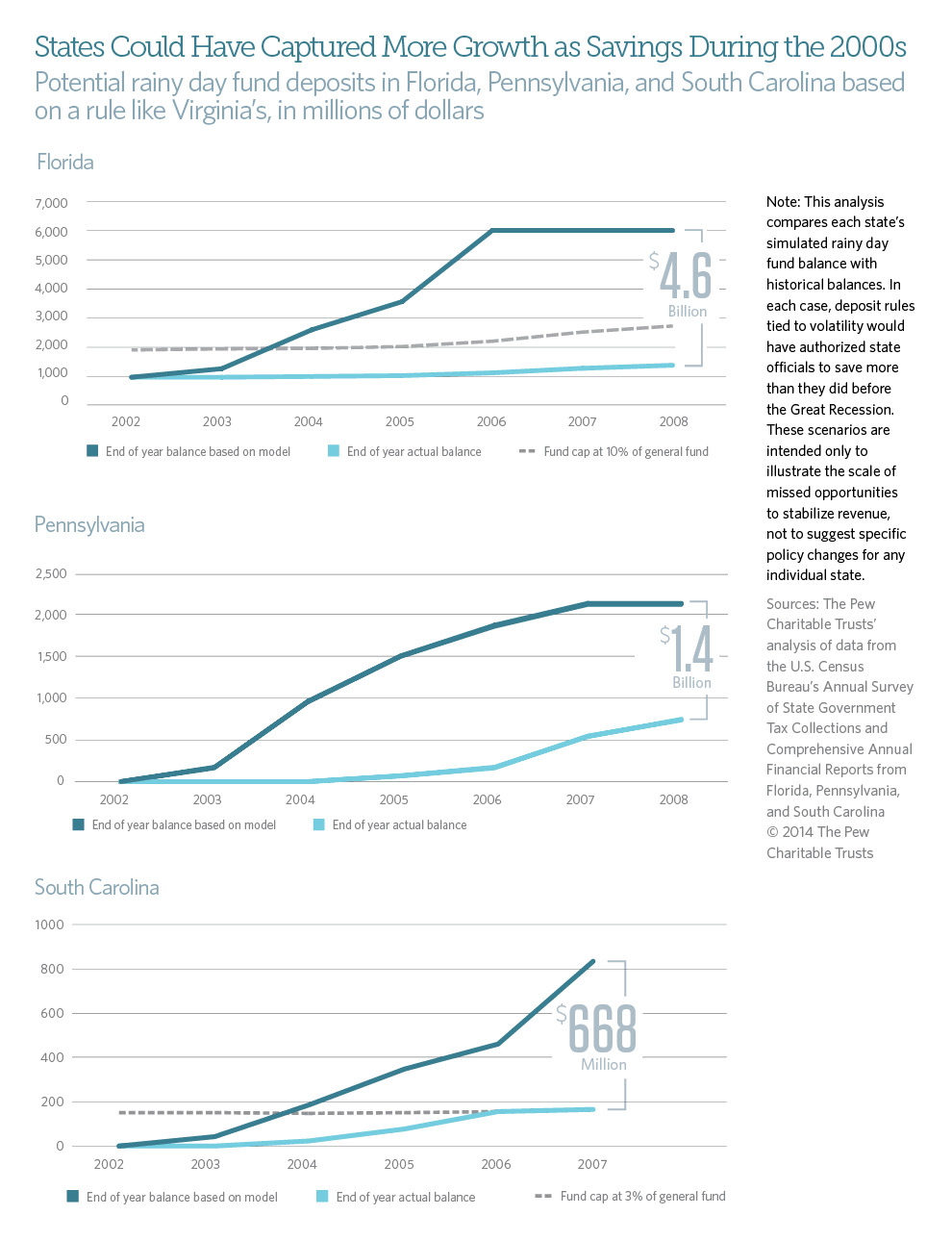 2Pew calculated annual deposits and fund balances for Florida, Pennsylvania, and South Carolina based on tax revenue data obtained from the Census Bureau (without controlling for tax policy changes). These calculations were compared with data on actual deposits and balances obtained from state documents (“2013 Florida Tax Handbook,” 27; Commonwealth of Pennsylvania, Comprehensive Annual Financial Report for the Fiscal Year Ended June 30, 2011, 224; South Carolina Budget and Control Board, “Historical Analyses,” 1.) This analysis assumes no economic impact to the state from saving this revenue rather than using it for additional appropriations, tax reductions, or another purpose. For South Carolina, the scenario runs from 2003-07 because policymakers withdrew money from their fund in 2008. The model did not suggest additional deposits in 2008.