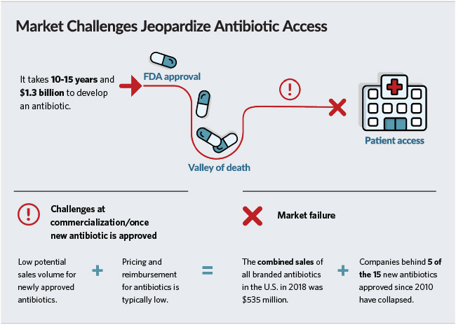 Sources: Wellcome Trust, “It’s Time to Fix the Antibiotic Market,” accessed Feb. 12, 2021, https://wellcome.org/what-we-do/ourwork/drug-resistant-infections/its-time-fix-broken-antibiotics-market.