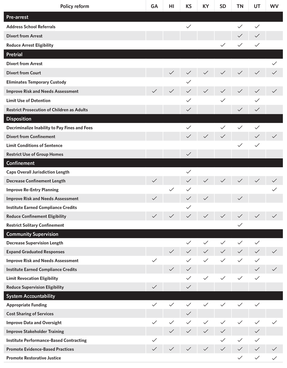 - The Pew Charitable Trusts, “Utah’s 2017 Juvenile Justice Reform Shows Early Promise” (2019), https://www.pewtrusts.org/en/research-and-analysis/issue-briefs/2019/05/utahs-2017-juvenile-justice-reform-shows-early-promise; The Pew Charitable Trusts, “Kansas’ 2016 Juvenile Justice Reform” (2017), https://www.pewtrusts.org/en/research-and-analysis/issue-briefs/2017/06/kansas-2016-juvenile-justice-reform; The Pew Charitable Trusts, “South Dakota’s 2015 Juvenile Justice Reform” (2016), https://www.pewtrusts.org/en/research-and-analysis/issue-briefs/2016/01/south-dakotas-2015-juvenile-justice-reform; The Pew Charitable Trusts, “West Virginia’s 2015 Juvenile Justice Reform” (2016), https://www.pewtrusts.org/en/research-and-analysis/issue-briefs/2016/05/west-virginias-2015-juvenile-justice-reform; The Pew Charitable Trusts, “Hawaii’s 2014 Juvenile Justice Reform” (2014), https://www.pewtrusts.org/research-and-analysis/issue-briefs/2014/07/hawaiis-2014-juvenile-justice-reform; The Pew Charitable Trusts, “Kentucky’s 2014 Juvenile Justice Reform” (2014), https://www.pewtrusts.org/en/research-and-analysis/issue-briefs/2014/07/kentuckys-2014-juvenile-justice-reform; The Pew Charitable Trusts, “Georgia’s 2013 Juvenile Justice Reform” (2013), https://www.pewtrusts.org/en/research-and-analysis/reports/0001/01/01/georgias-2013-juvenile-justice-reform; Joint Ad-Hoc Tennessee Blue Ribbon Task Force on Juvenile Justice, “Final Report” (2017), https://www.tn.gov/content/dam/tn/tccy/documents/youth-justice/JJ-BlueRibbon-Report-2018.pdf.