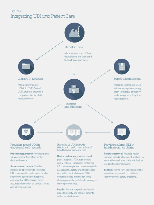 Patients, physicians, health plans, and FDA often lack information on long-term patient outcomes associated with approved medical devices. Integrating UDI into electronic health records, adverse event reports, registries, and insurance claims would allow health plans and FDA to understand how the device performs in large numbers of patients over long periods of time.4