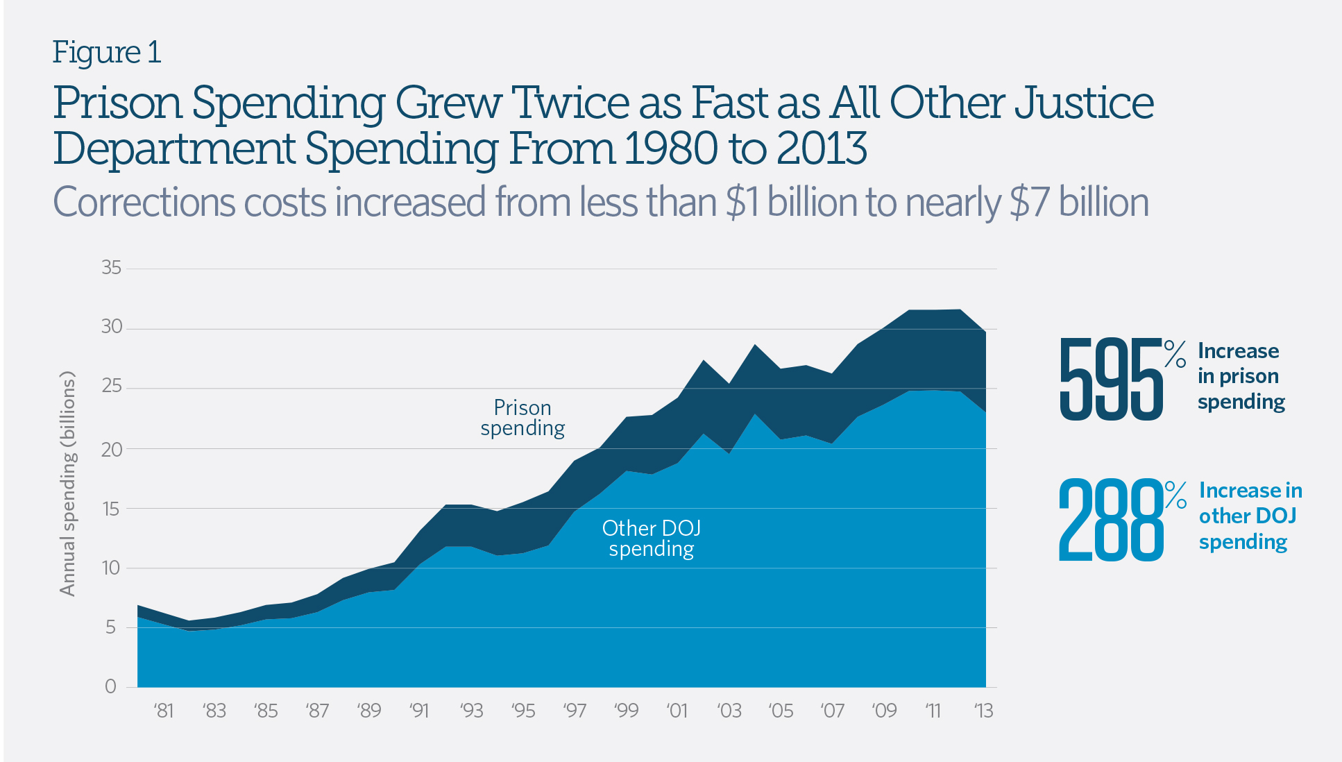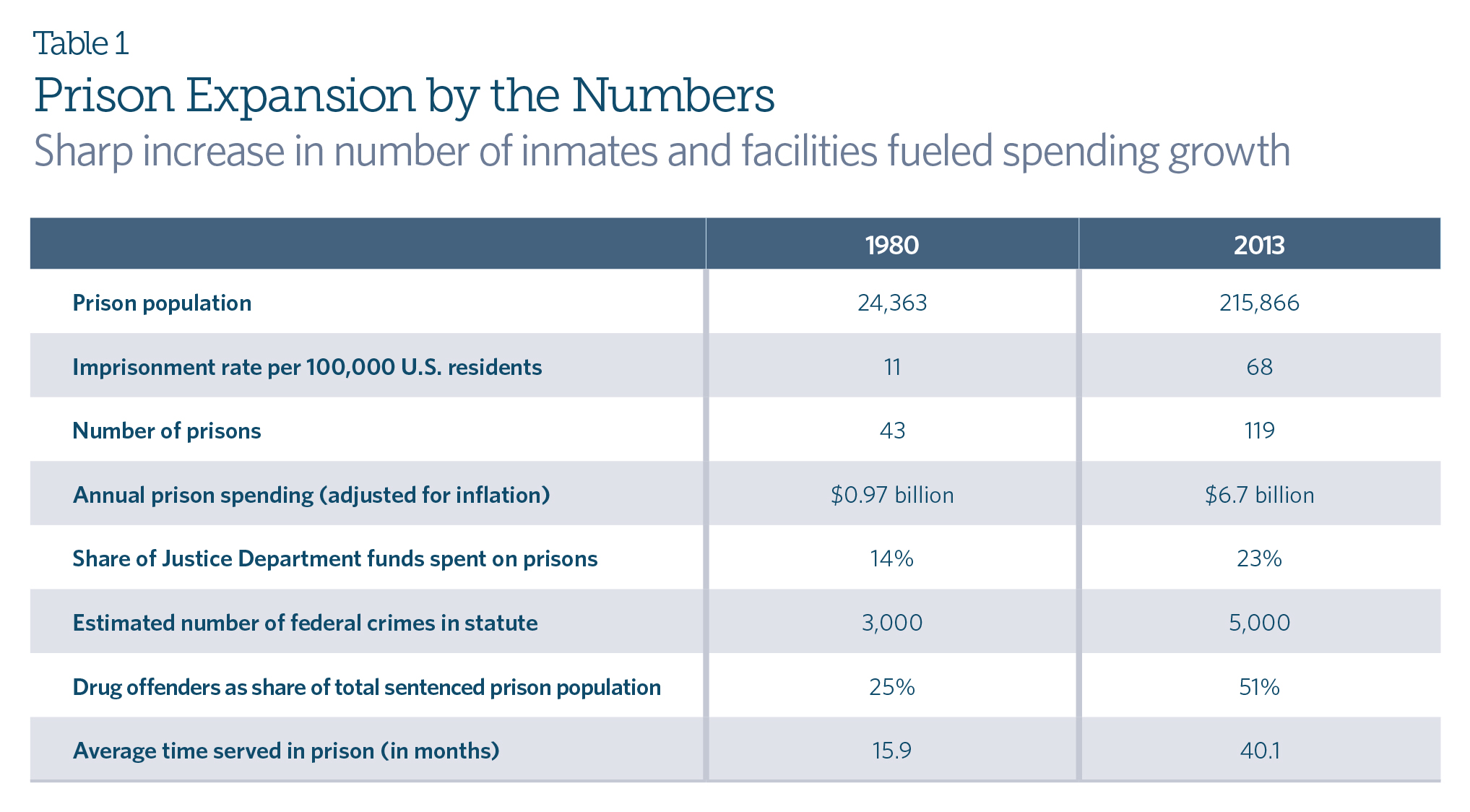 From 1980 to 2013, the number of offenders incarcerated in federal prisons increased from approximately 24,000 to more than 215,000, making the federal system the largest in the nation.1 Policy choices contributed significantly to this expansion as lawmakers added criminal laws to the books, lengthened sentences, and abolished parole.2 To accommodate the growing inmate population, the number of federal prisons nearly tripled, driving a surge in corrections spending.3 Taxpayers spent almost as much on federal prisons in 2013—$6.7 billion—as they spent to fund the entire U.S. Department of Justice in 1980, after adjusting for inflation.4 Despite these expenditures, recent data show that a third of all offenders who leave federal prisons under community supervision return to custody for violating the terms of their release.5