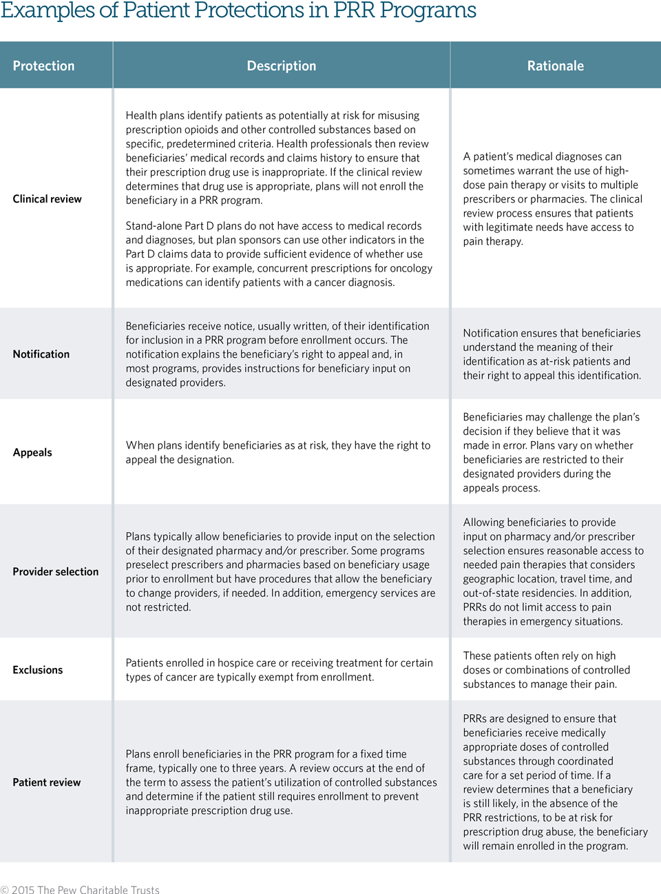 Each year, more than 16,000 people in the United States die from prescription opioid overdoses.1 As one strategy to minimize these events and other harms associated with prescription drug abuse, public and private insurance plans are using patient review and restriction (PRR) programs to encourage the safe use of opioids and other controlled substances. PRR programs identify patients who are at risk for prescription drug abuse and ensure that they receive controlled substance prescriptions only from designated pharmacies and prescribers.