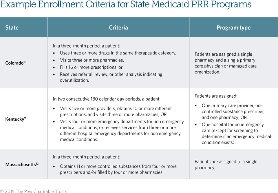 Today, 46 state Medicaid fee-for-service programs9 and numerous Medicaid managed care and private plans utilize PRR programs. These plans use different criteria to identify patients who are potentially misusing controlled substances, but most programs consider patients at risk once they obtain a predetermined number of prescriptions from a specific number of prescribers and/or pharmacies. Table 2 describes the criteria from three state Medicaid PRR programs.