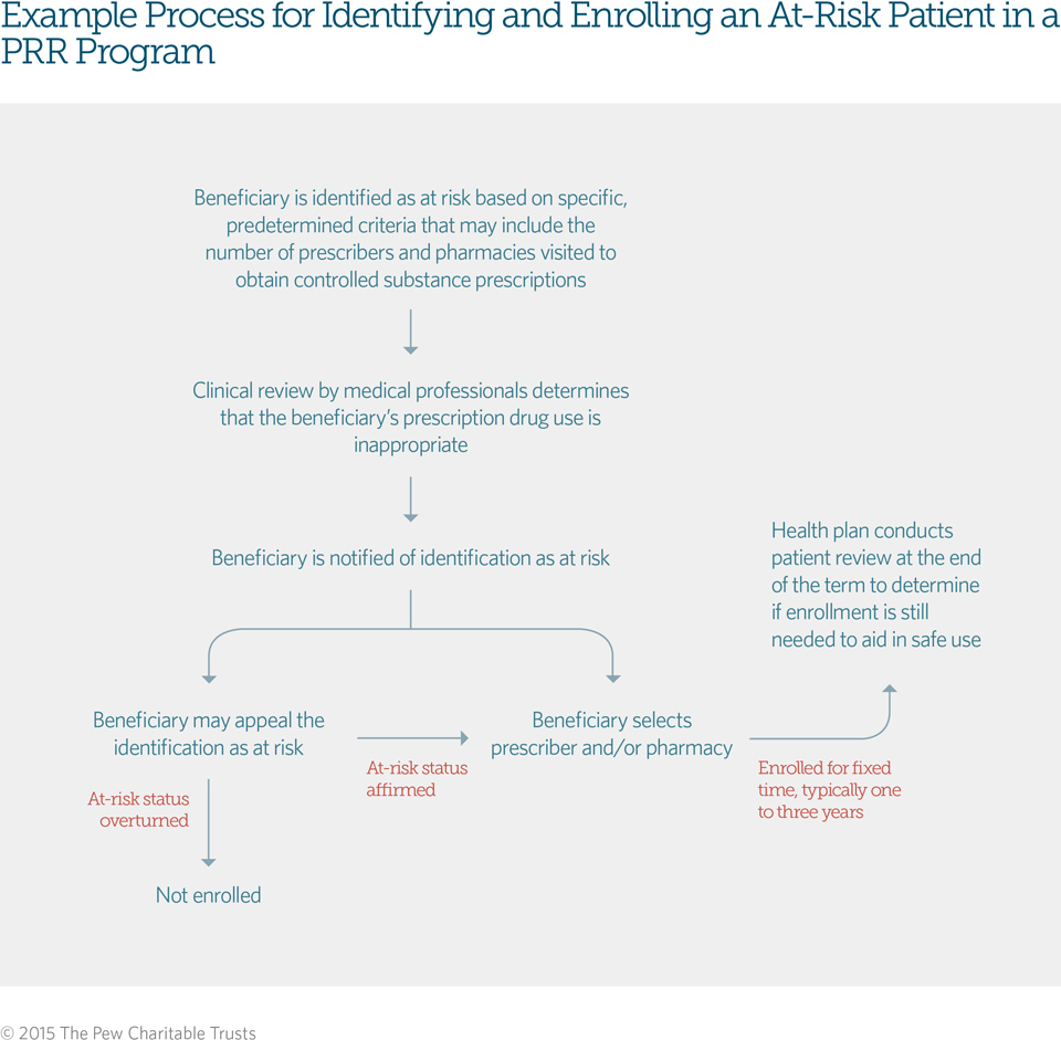 PRR programs have the potential to curb prescription drug abuse and improve continuity of care for at-risk patients. Specifically, these programs allow plans to designate one or more health care providers to supply all of the patient’s controlled substance prescriptions. If a patient enrolled in a PRR program visits a nondesignated prescriber or pharmacy without a referral other than in emergency circumstances, the health plan will not process the claim. Using designated providers helps coordinate patient care by ensuring that prescribers and pharmacists do not unintentionally prescribe or fill inappropriate opioid prescriptions. See Figure 1 for an example of the process used to identify and enroll patients in a PRR program.