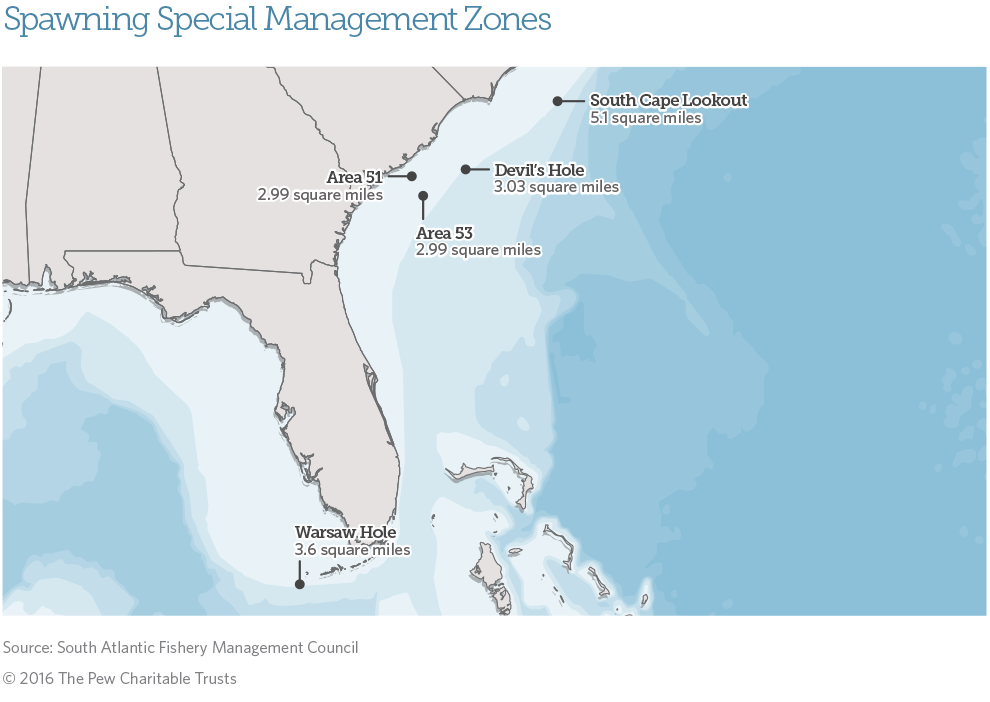 Southeast U.S. fishery managers approved a plan in March 2016 to protect five fish spawning areas off southern Florida, North Carolina, and South Carolina. In these designated spawning special management zones (SSMZs), fishing is permitted at the surface but prohibited in deep water.