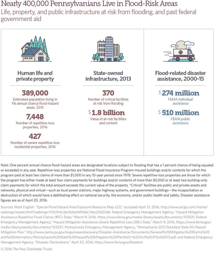 - Sum of individual assistance and public assistance for Pennsylvania flood-related major disaster and emergency declarations from 2000 to 2015. Federal Emergency Management Agency, “Disaster Declarations,” accessed April 20, 2016, https://www.fema.gov/disasters.