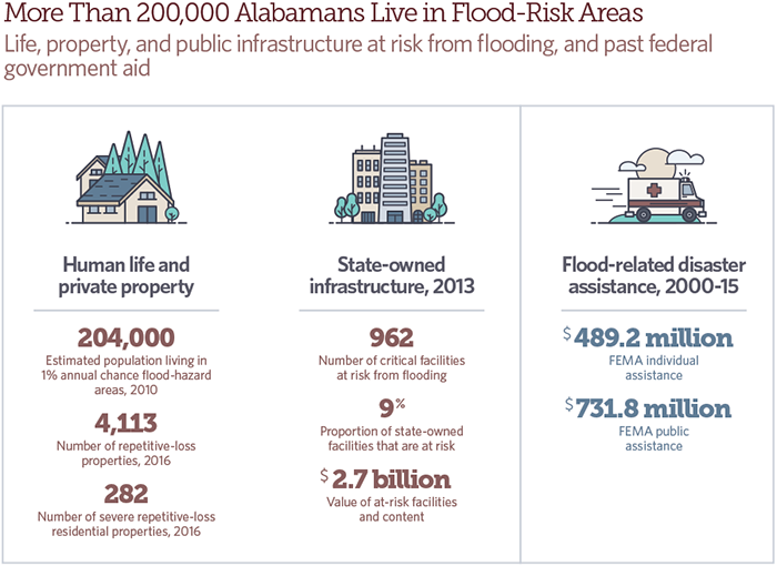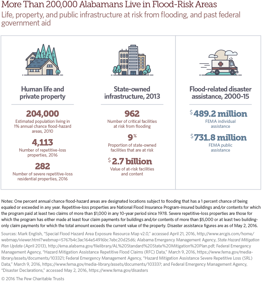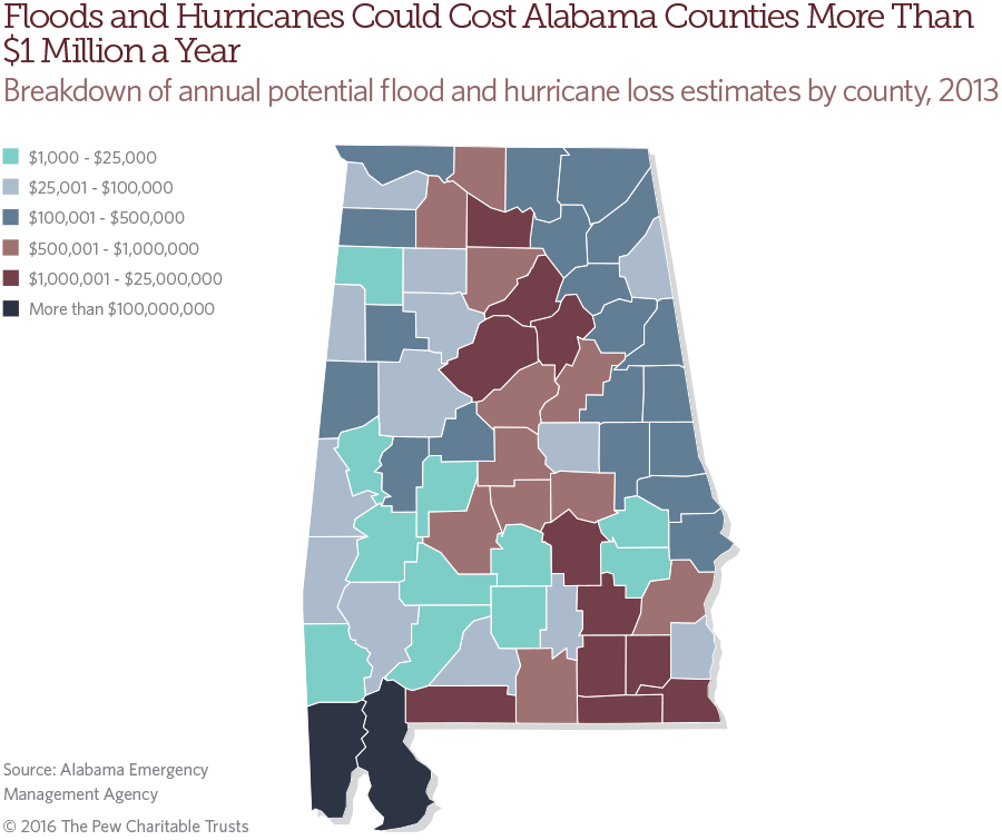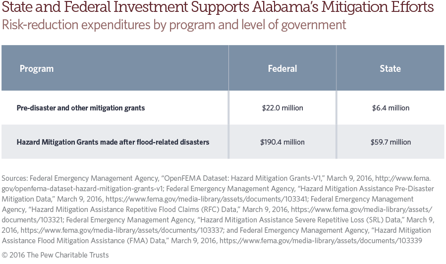 - Sum of individual assistance and public assistance for Alabama flood-related major disaster and emergency declarations from 2000 to 2015. Federal Emergency Management Agency, “Disaster Declarations,” accessed May 2, 2016, https://www.fema.gov/ disasters.