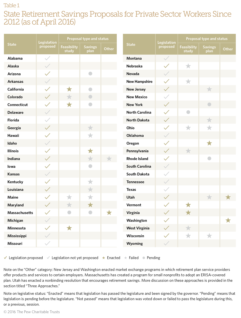 Since 2012, half of the states have introduced legislation to study or establish state-sponsored retirement savings programs for workers at private sector or nonprofit employers without plans. This fact sheet, one of a series, summarizes The Pew Charitable Trusts’ analysis of current approaches in the states.