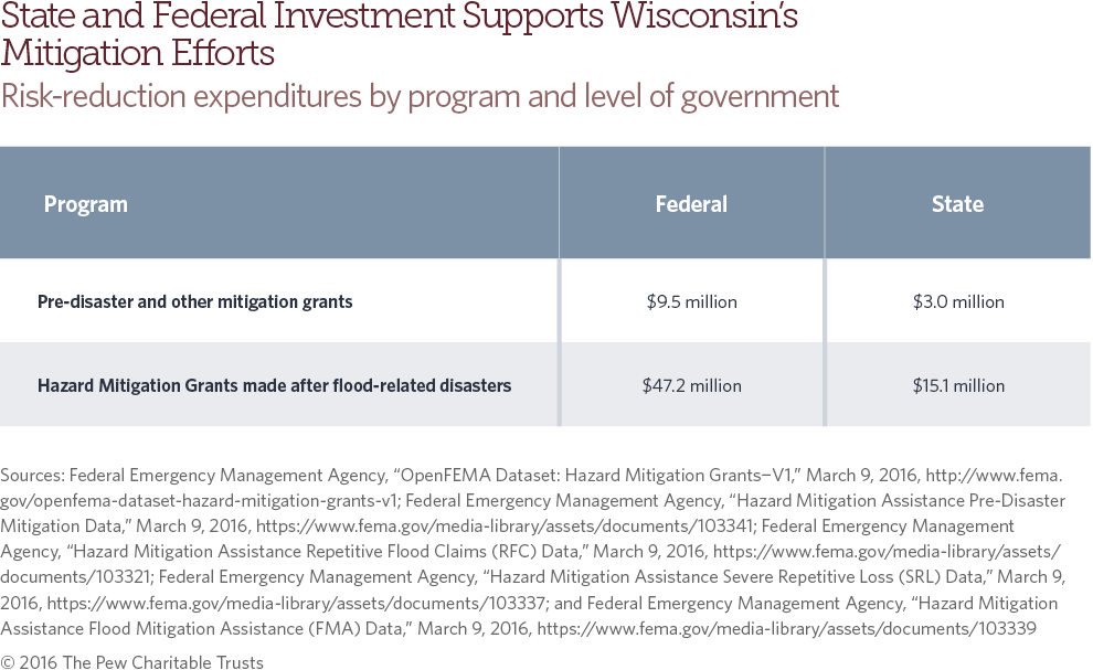- Sum of individual assistance and public assistance for Wisconsin flood-related major disaster and emergency declarations from 2000 to 2015. Federal Emergency Management Agency, “Disaster Declarations,” accessed May 26, 2016, https://www.fema.gov/disasters.