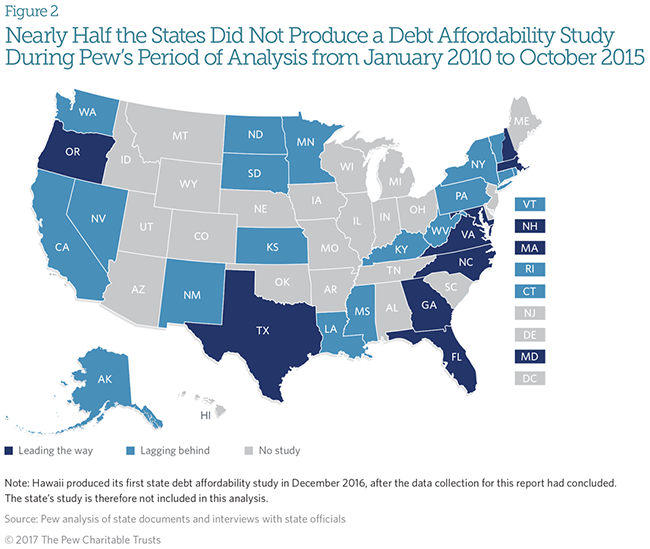 Pew’s research found that 27 states conduct debt affordability studies. Of those, nine lead the way by producing studies that give policymakers a clear understanding of their states’ debt levels through careful projections, smart benchmarking comparisons, multiple descriptive metrics, and analysis, among other things. The 18 other states could improve their debt affordability studies by adding elements such as an expanded scope of analysis.