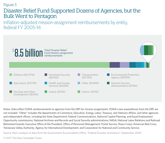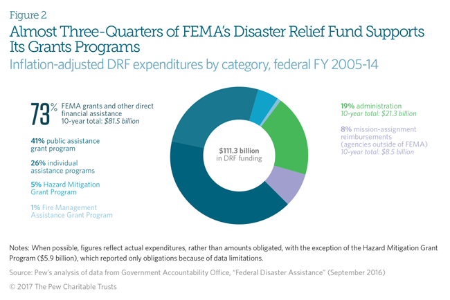 The Pew Charitable Trusts analyzed the Disaster Relief Fund (DRF) to better understand its role within federal disaster assistance provided to American communities. Specifically, the researchers looked at the importance of DRF funding to total disaster spending of the 17 federal entities identified by GAO as having “responsibility for leading or coordinating” disaster assistance; which programs and activities the fund supports; and how monies from the fund are distributed among agencies. The findings show that although vital, the fund is really only part of the federal government’s “all hands on deck” approach to disaster response.3