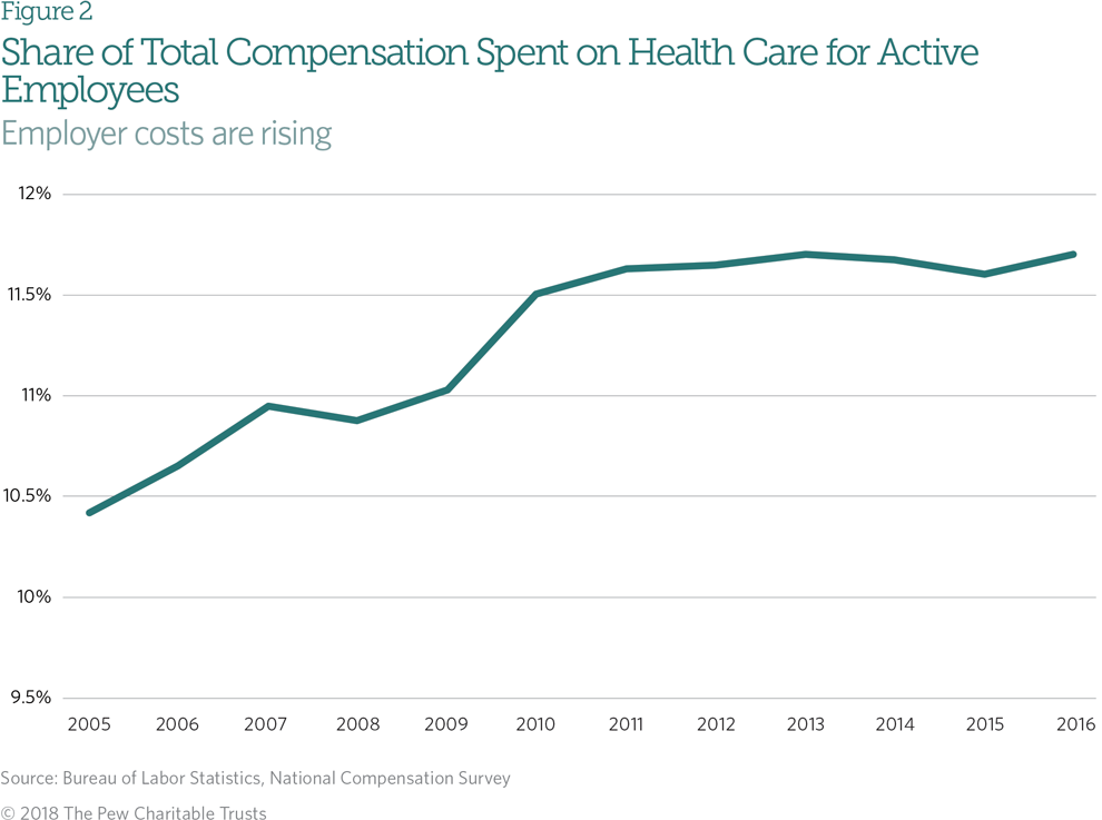 Retiree health care costs account for almost all of states’ OPEB liabilities, and the price tag for health care is continuing to rise. The average annual health care premiums for single coverage rose 24 percent from 2010 to 2015, and premium costs for family coverage have risen 61 percent over the past decade.1 Consequently, employer health care costs as a percentage of total compensation have also increased. Figure 2 illustrates the increase in employer contributions for active employees.