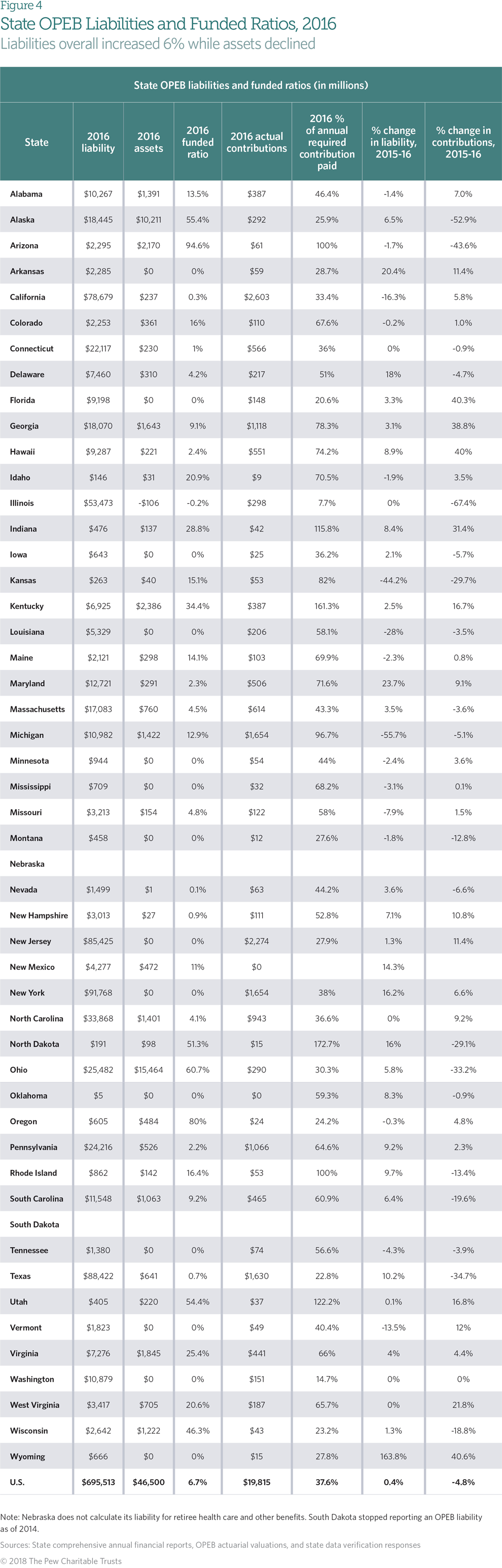 States reported a total liability of $696 billion in nonpension retirement benefits for their employees, known as other post-employment benefits (OPEB), in 2016. This figure represents a 0.4 percent increase from 2015, when states reported $692 billion in liabilities. However, states had only $46 billion in assets in 2016 to pay for these benefits—a slight drop from the $48 billion they reported in 2015. This fact sheet serves as a data update to a 2017 issue brief from The Pew Charitable Trusts, “State Retiree Health Care Liabilities: An Update,” and explores two options to help states better manage rising OPEB costs.