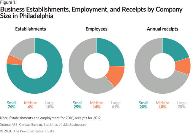 Small businesses (those with one to 99 employees) and midsize businesses (those with 100-499 employees) play a crucial role in Philadelphia as employers, taxpayers, neighborhood institutions, innovators, and wealth builders. In August 2020, The Pew Charitable Trusts examined these companies and compared data from Philadelphia with that of other large U.S. cities in a detailed report titled “Philadelphia’s Small and Midsize Business Landscape.” This fact sheet provides some of the key findings from that research.