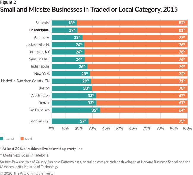 As for market reach, 81% of small and midsize businesses in Philadelphia depended on customers within the region (known as “local” business activity). Other cities, especially those with lower poverty rates, tended to have a higher share of businesses with customers outside their home regions (“traded” activity); only 19% of small and midsize businesses in Philadelphia fell into this category.2 Economists say the former activity keeps dollars circulating locally, while the latter is more likely to grow the local economy.