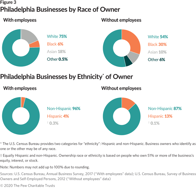 Most businesses with employees in Philadelphia are owned by white people; those without employees, such as “gig” contracting businesses, have higher ownership by other racial and ethnic groups, and have been the main locus of entrepreneurship for Black and Hispanic residents. City officials have made boosting entrepreneurship by underrepresented groups a focus of their economic development programs.