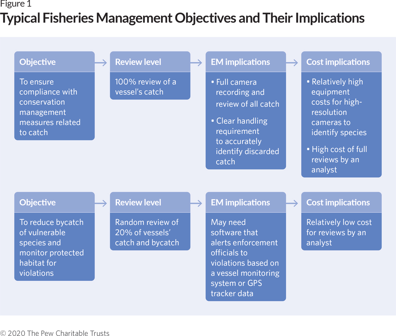 Once objectives have been agreed upon, managers should decide the appropriate level of EM coverage—what percentage of the fleet would need to have EM systems installed and what activities would need to be recorded. Ideally, all vessels should be required to capture all activities electronically. If an EM system is not required on all vessels, operators who must participate might become frustrated by the lack of full accountability across the entire fishery. Full coverage would ensure proper oversight, and the data collected would represent all fisheries— and reduce the chance that vessel operators change their fishing practices when an observer is present.