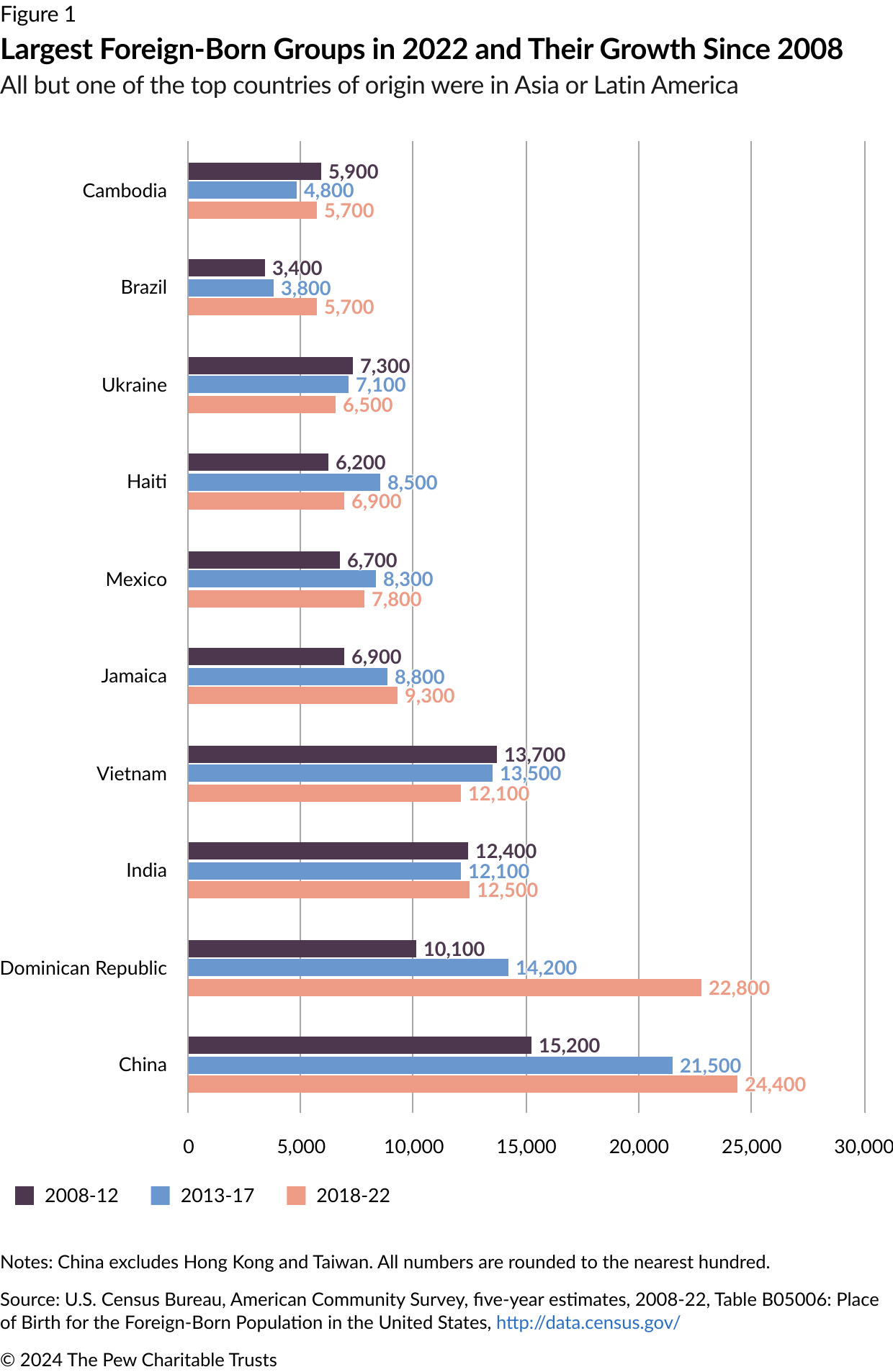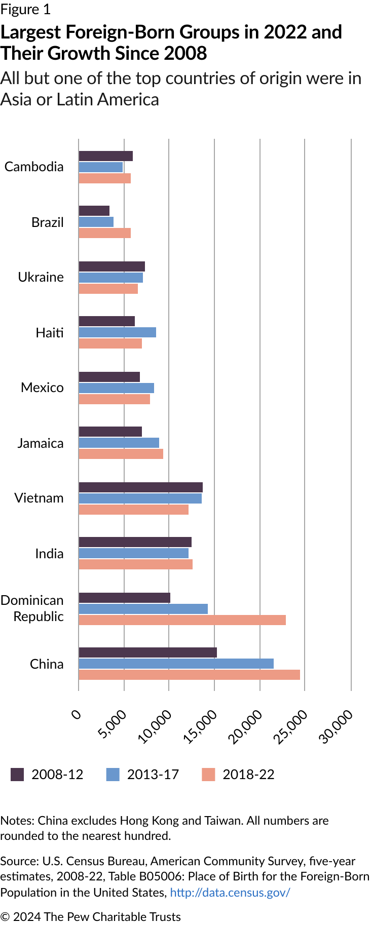 For the last two decades, people born in China (not including Hong Kong and Taiwan) were among the largest foreign-born groups living in Philadelphia, totaling 24,400 in the 2018-22 period—representing almost 1 in 10 of the city’s immigrants. More recently, an influx of residents born in the Dominican Republic has put Dominicans on track to become Philadelphia’s largest immigrant group. Since 2000, only a few groups have decreased significantly in size, while the number of immigrants from Ukraine, Vietnam, and elsewhere has fluctuated. (See Figure 1.)