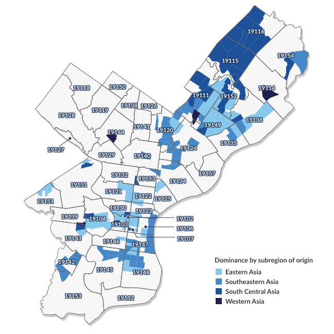 Philadelphia’s foreign-born residents come from every corner of the globe, some in bigger numbers than others. They often congregate in pockets where they can find support, affordability, opportunities, and shared languages, although those concentrations also dissipate or shift over time as they integrate into the fabric of Philadelphia.
