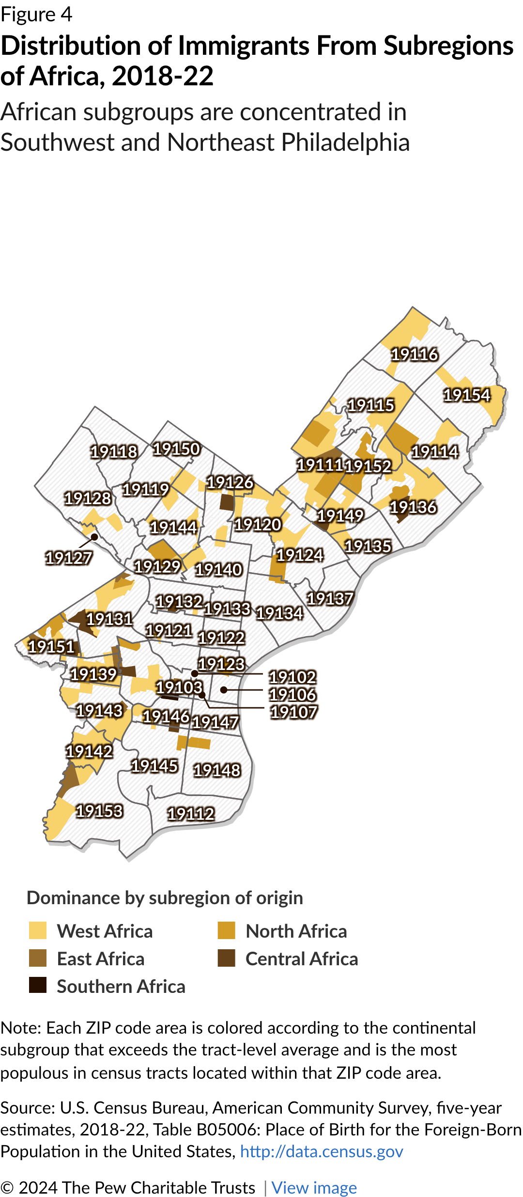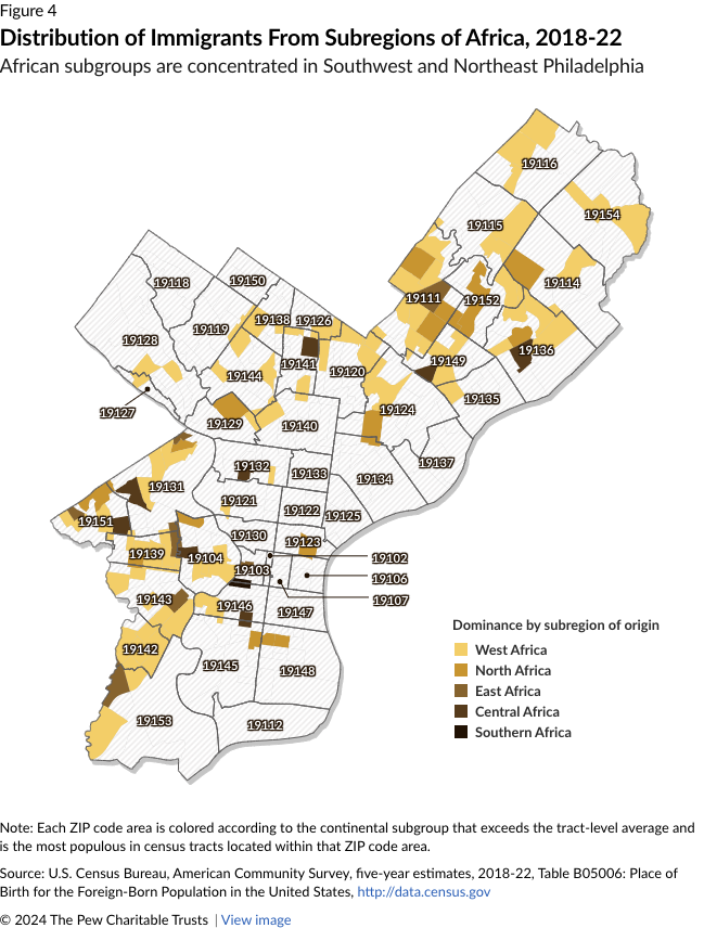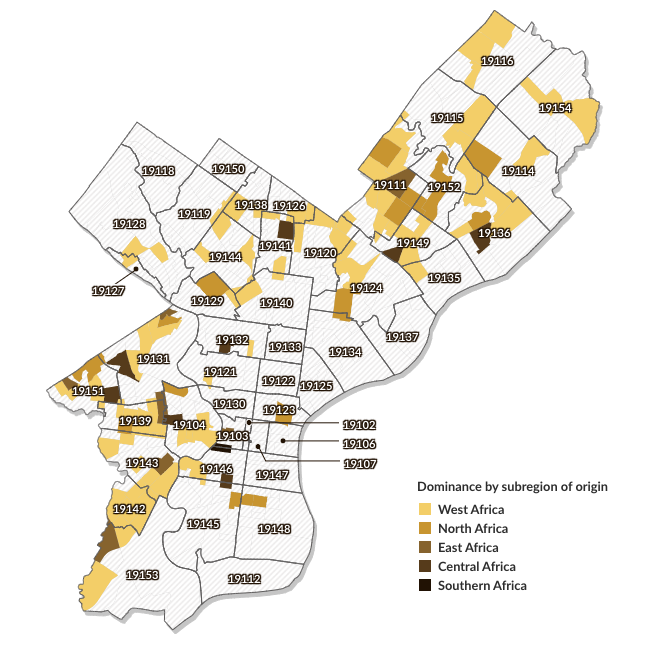 Although Africans are the second-smallest continental group of immigrants in Philadelphia, after people from Oceania, some subgroups are especially concentrated and entrepreneurial. Liberians, Nigerians, and other West African immigrants have a sizable business and community presence in Southwest Philadelphia, where several groups are building an “Africatown” complex. African immigrants from Egypt and Morocco are most concentrated in Northeast Philadelphia. And many immigrants from Cameroon and elsewhere in Central Africa live in West Philadelphia. (See Figure 4.)
