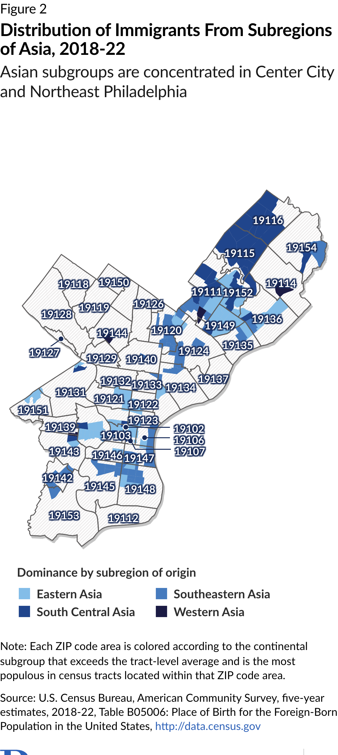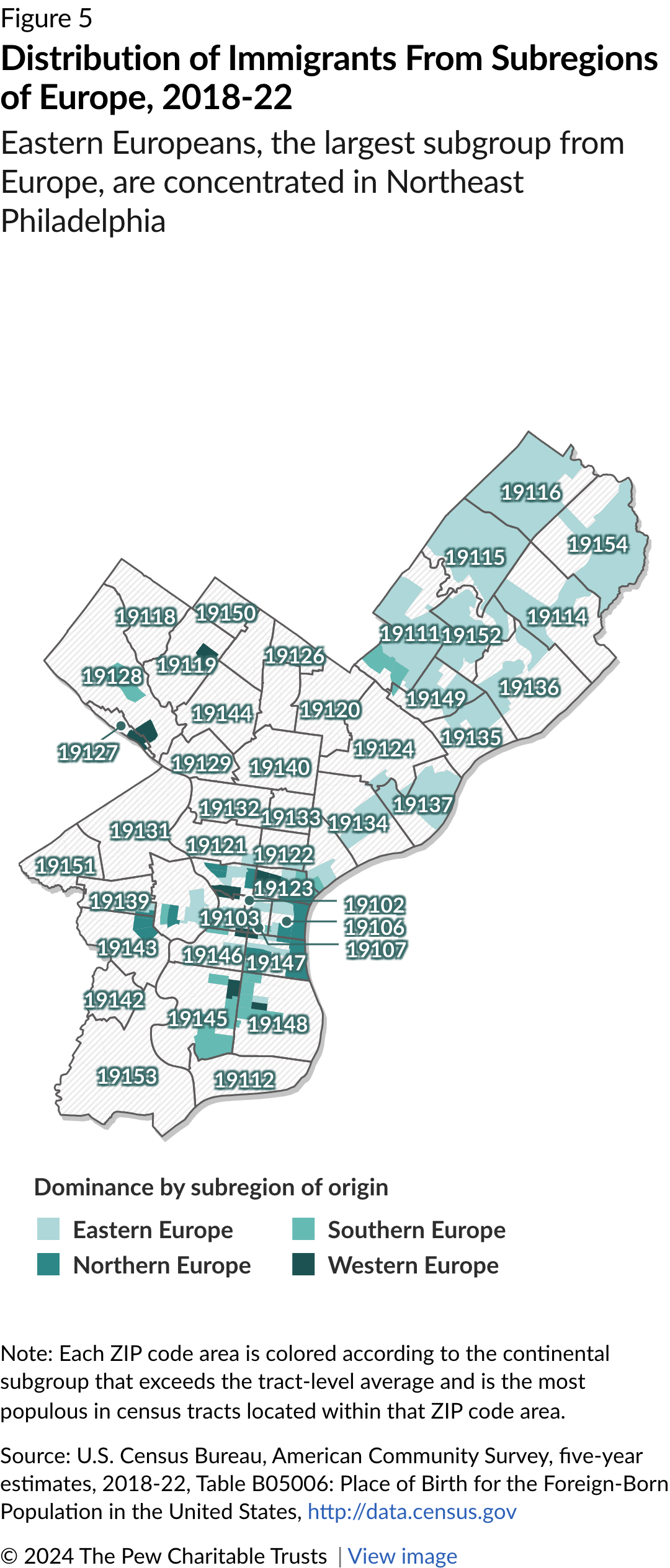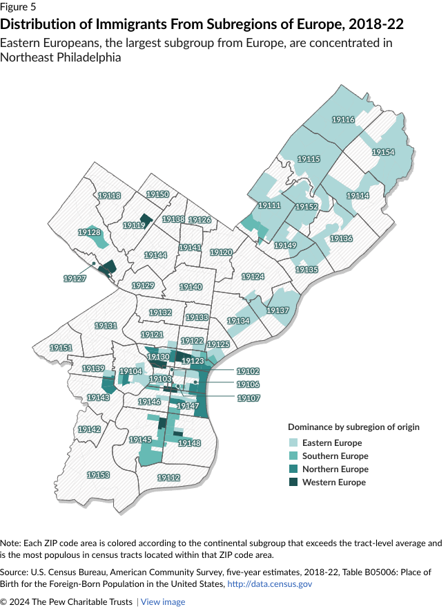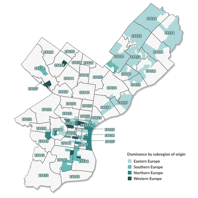Through the first half of the 20th century, Western Europeans born in Ireland, Italy, Germany, and elsewhere were the largest immigrant groups by continent of origin in Philadelphia. Today, Eastern Europeans—namely Albanians, Ukrainians, and others from post-Soviet countries—are dominant, with their largest concentrations in Rhawnhurst and Bells Corner in the Northeast. (See Figure 5.)