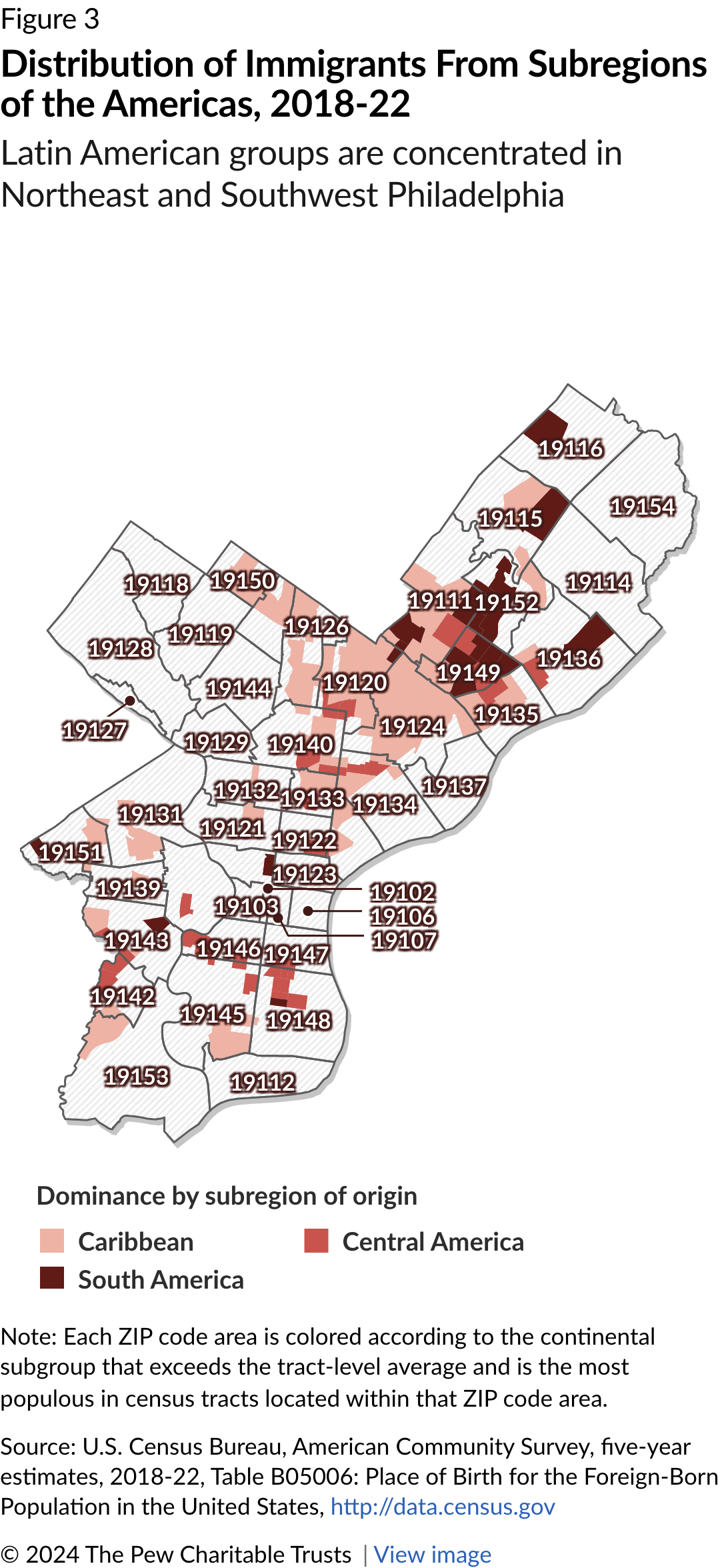 Caribbean immigrants represent more than half (56%) of Philadelphia immigrants from the region encompassing South America, Central America, and the Caribbean. Most are from the Dominican Republic, Jamaica, and Haiti, and they live predominantly in Northeast and Southwest Philadelphia. South Americans, mostly from Brazil and Colombia, are largely concentrated in the Far Northeast and parts of Center City. Immigrants from Mexico and Guatemala are the largest groups among people counted as Central American by the U.S. Census Bureau and are settled largely in South Philadelphia and parts of the Northeast. (See Figure 3.)