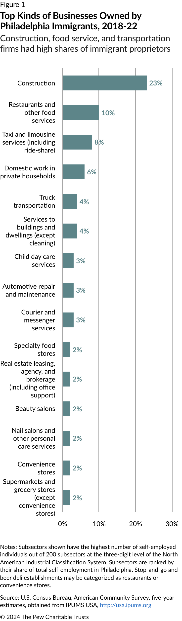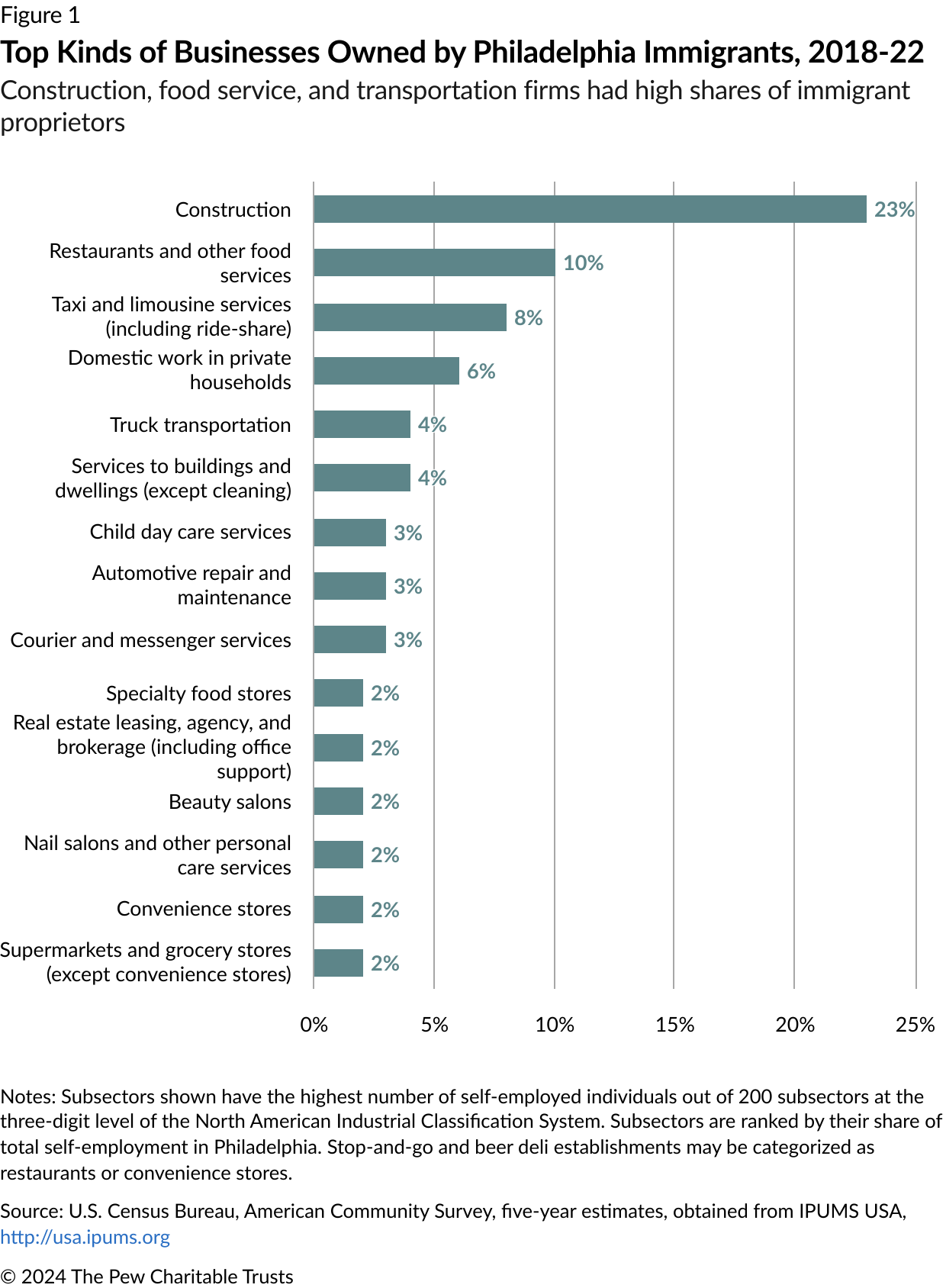 Construction firms, restaurants, taxi and trucking companies, and housecleaning services were the most common types of businesses owned by Philadelphia’s self-employed immigrants in the 2018-22 period. (See Figure 1.) In contrast, the top sectors for U.S.-born entrepreneurs were construction; management, scientific, and technical consulting; and independent (freelance) art, writing, and performance services.