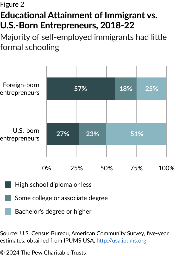 In the 2018-22 period, a majority of all self-employed immigrants in Philadelphia ages 25 and older had a high school diploma or less education. For these individuals, there may have been limited choices other than entrepreneurship. Indeed, Philadelphia immigrants with college degrees were much less likely to be self-employed entrepreneurs than those without college degrees, as measured by the Census Bureau’s self-employment category, which does not capture owners or founders of large companies.6 In contrast, the majority of Philadelphia’s U.S.-born self-employed entrepreneurs had college degrees. (See Figure 2.)