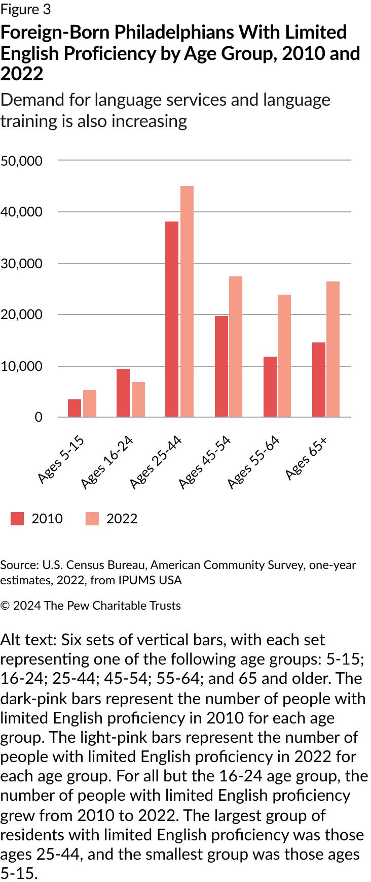 From 2010 to 2022, the population of foreign-born Philadelphians over the age of 5 who reported speaking English less than “very well”—which is how limited English proficiency, or LEP, is defined—grew 39%, to around 134,600. (Another nearly 48,000 people with limited English proficiency were U.S.-born, coming mainly from Puerto Rico.) All but one age group of Philadelphia residents with limited English proficiency increased in number over that decade, as shown in Figure 3.