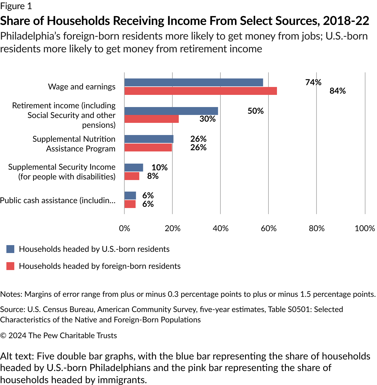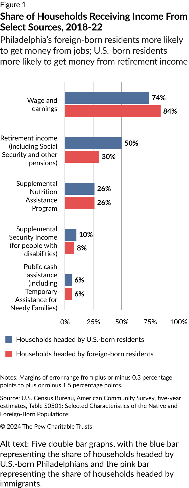 At the same time, a smaller share of immigrant-led households in Philadelphia got income from retirement nest eggs than U.S.-born households did (30% vs. 50%). That was a result of several factors: Immigrants tend to have lower earnings and accumulate fewer working years in the United States, and they are less likely than U.S.-born workers to hold jobs with pension benefits. In addition, a smaller share of immigrants than U.S.-born workers qualify for Social Security benefits, and noncitizens without permanent resident status don’t qualify at all, even though some pay into the system via withholding at their jobs.4
