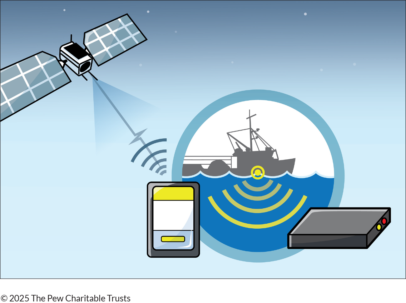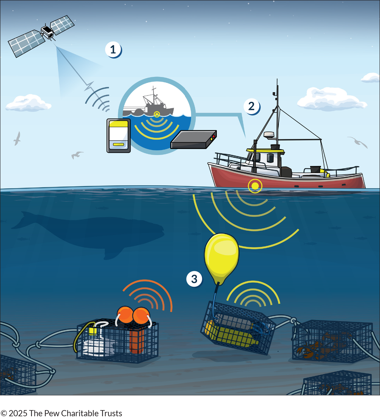 This illustration shows (1) a centralized cloud-based system for storing, translating, and sharing data received about the location of gear from (2) equipment on the vessel, which in turn communicates with (3) receivers on seafloor gear.