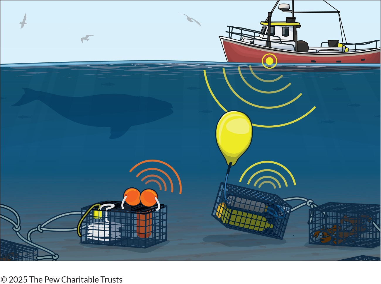 Temporary and season-long closures of fishing areas are increasingly used as a tool to protect whales, especially the endangered North Atlantic right whale, from entanglement in fishing gear. To enable harvesters to fish safely in these closed areas, on-demand systems—a modern configuration of traditional gear that removes the end lines on fixed traps or trawls—offer a promising solution. While on-demand fishing has made significant progress in many technical aspects, some obstacles remain, including addressing harvesters’ new challenge in avoiding others’ gear and enabling enforcement personnel to effectively oversee the fishery’s smooth operation. Fisheries and Oceans Canada, also known by the abbreviation DFO, can accelerate the widespread adoption of on-demand gear by including three requirements as it develops new rules: acoustic methods to locate gear, a universal standard for transmitting information, and a centralized cloud-based system for sharing data.