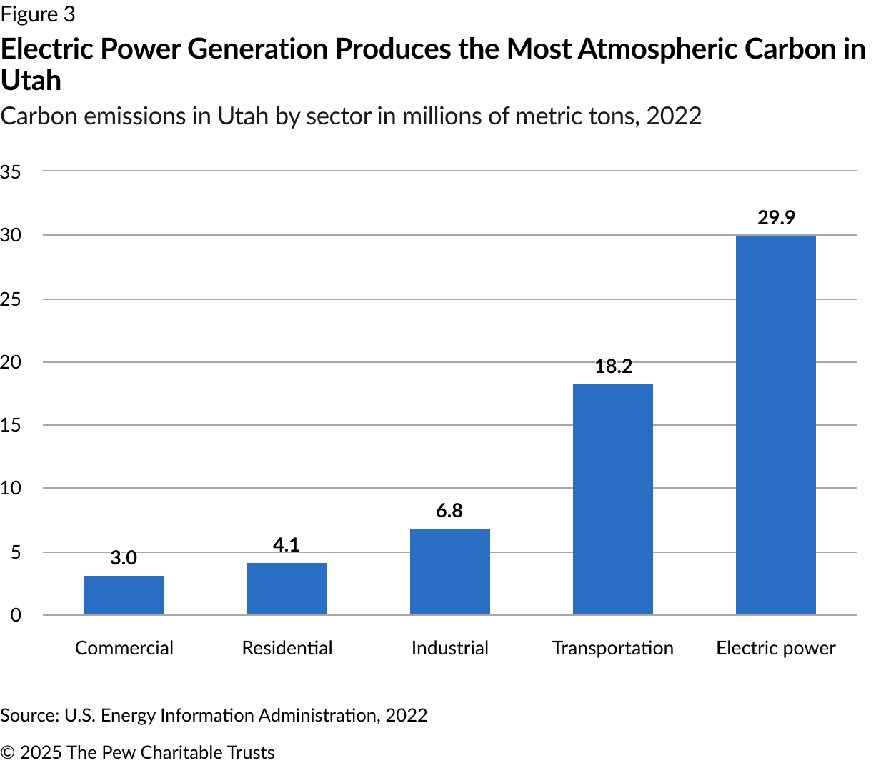 Carbon dioxide emissions from the burning of fossil fuels in the electric power and transportation sectors are the leading contributors to global warming. In 2021, Utah had the 31st-lowest total carbon emissions among the 50 states and Washington, D.C., but ranked 20th in the nation for per capita emissions, of which 44% came from the electric power sector and 32% from the transportation sector.11 (See Figure 3.)