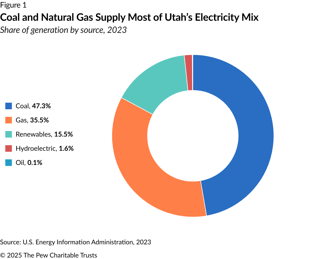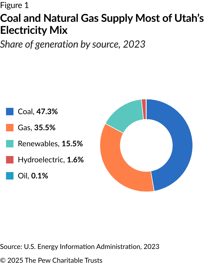 For decades, Utah has been a net exporter of energy, but in recent years a growing share of its electric generation has been used in-state.2 The state produces nearly 85% of its energy from fossil fuels, mainly coal and natural gas, with the balance coming from solar, wind, and other renewables. (See Figure 1.)