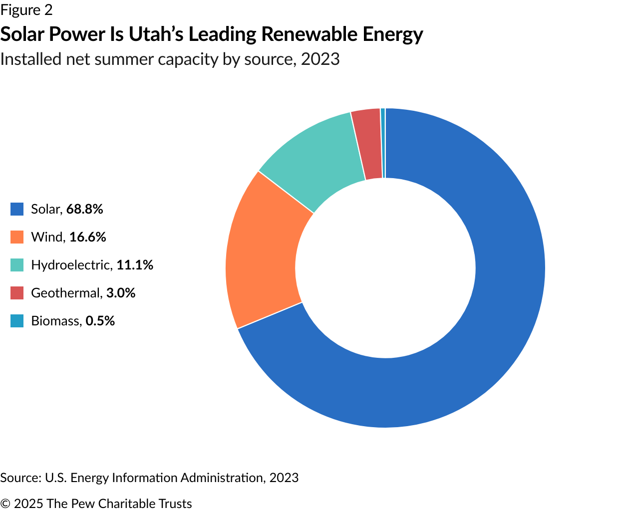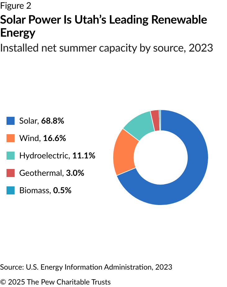 In Utah, 15.5% of all utility-scale electric power generated in 2023 came from renewable energy sources, up from 13% in 2022.7 Most of the state’s renewable generation comes from solar, wind, and hydroelectric. (See Figure 2.)