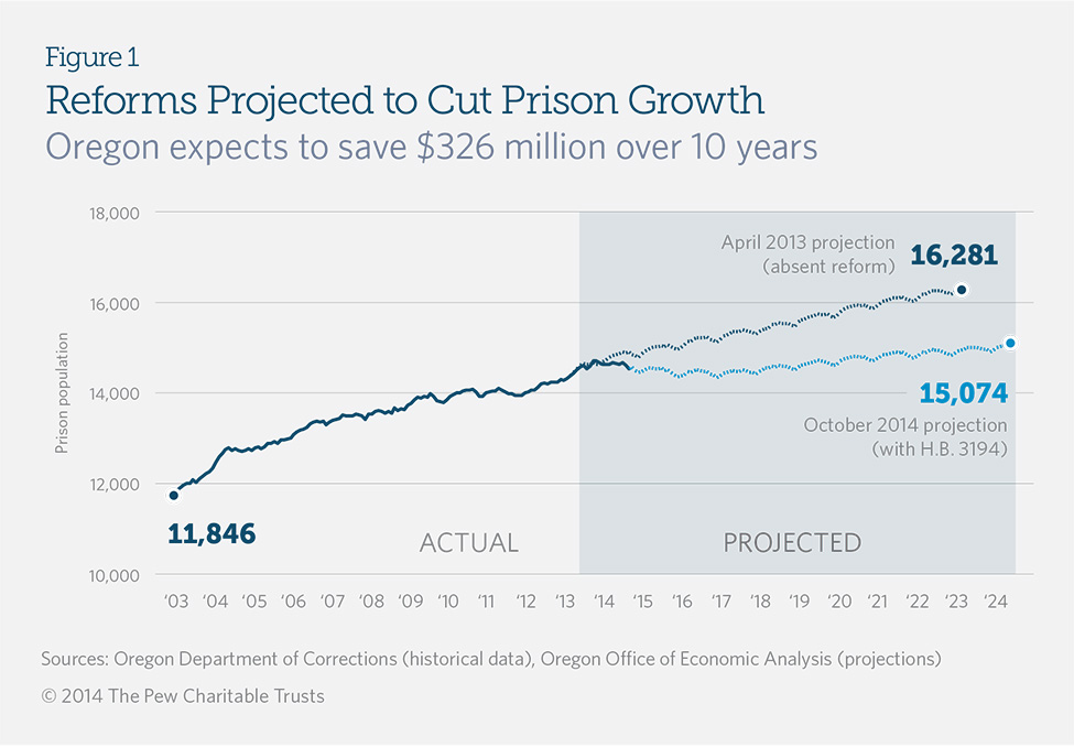 Anticipating substantial growth in prison population and costs, Oregon lawmakers in 2013 enacted comprehensive sentencing and corrections reform legislation (House Bill 3194). Since then, the state has stabilized its prison population and redirected nearly $58 million in savings to front-line public safety programs shown to cut crime and reduce recidivism.