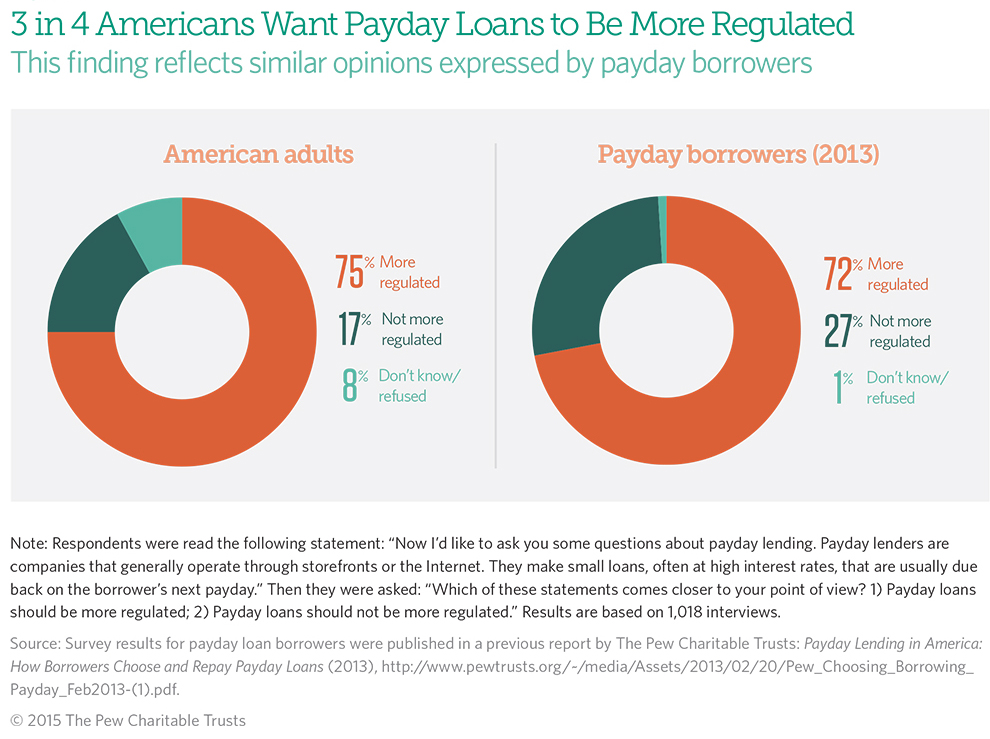 - 75 percent of respondents believe that payday loans should be more regulated; similarly, in a 2013 Pew survey, 72 percent of payday loan borrowers said they wanted more regulation. (See Figure 2.)