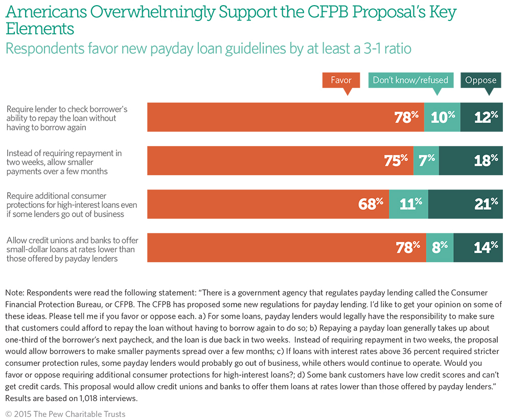 In March 2015, the Consumer Financial Protection Bureau (CFPB), the federal agency with authority over payday loans, proposed a framework for regulating these and similar loans. The Pew Charitable Trusts then conducted polling in May to gauge Americans’ views on payday lending, the key elements of the CFPB proposal, and the types of loans that would be likely to result from it. The survey found that: