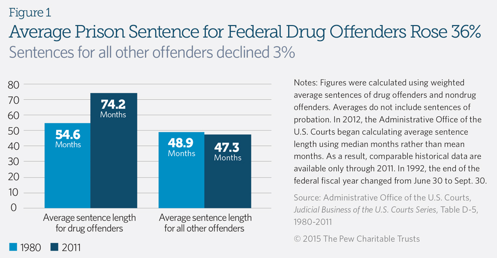 - The length of drug sentences has increased sharply. As shown in Figure 1 above, from 1980 to 2011 (the latest year for which comparable statistics are available), the average prison sentence imposed on drug offenders increased 36 percent—from 54.6 to 74.2 months—even as it declined 3 percent for all other offenders.12