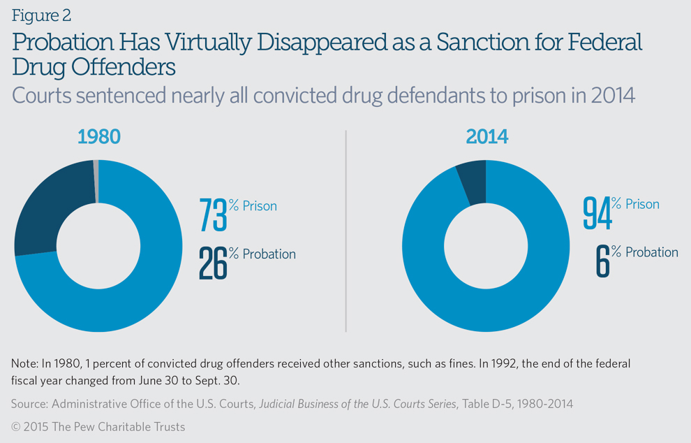 - Probation has all but disappeared as a sanction for drug offenders. In 1980, federal courts sentenced 26 percent of convicted drug offenders to probation. By 2014, the proportion had fallen to 6 percent, with judges sending nearly all drug offenders to prison.11 (See Figure 2.)