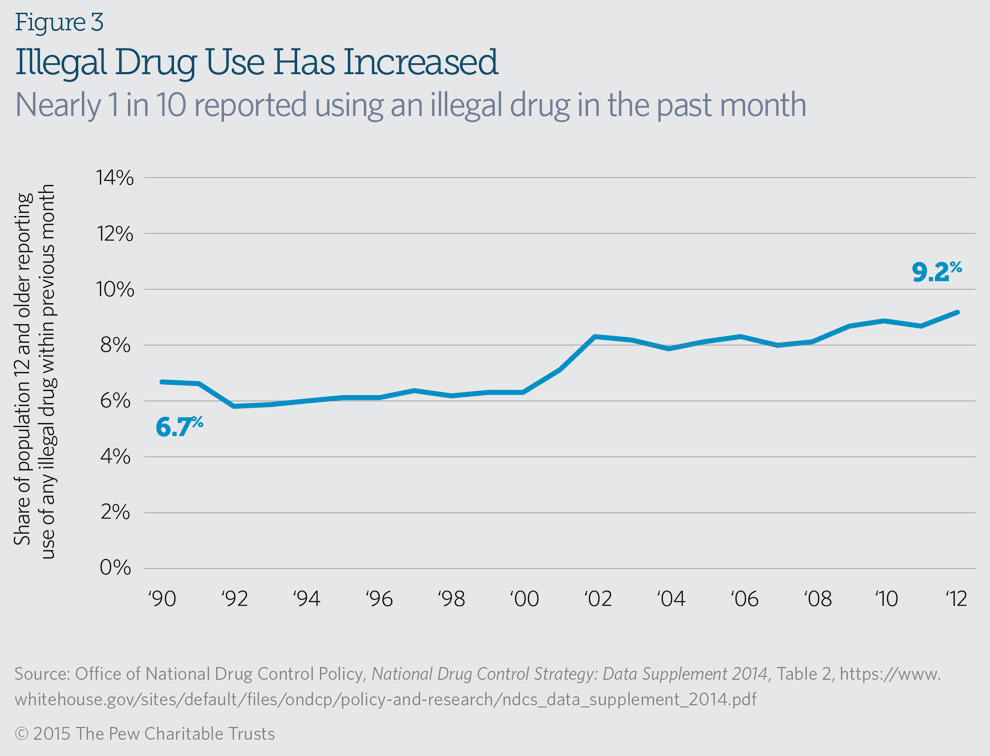 - Illegal drug use has increased. The share of Americans age 12 and older who said in a national survey that they had used an illicit drug during the previous month increased from 6.7 percent in 1990 to 9.2 percent—or nearly 24 million people—in 2012.22 (See Figure 3.) An increase in marijuana use helped drive this trend, more than offsetting a decline in cocaine use.