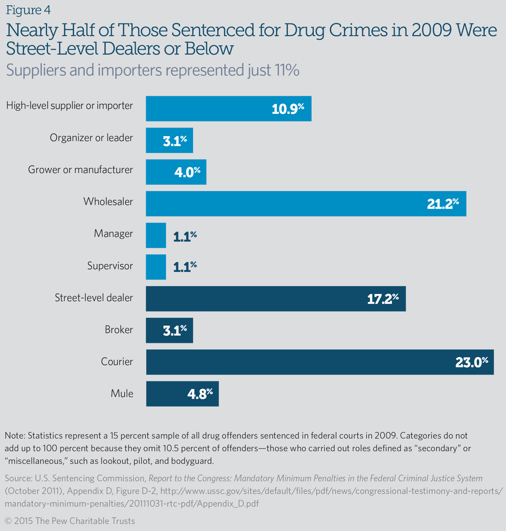 - Unless otherwise indicated, all data about offender roles are drawn from U.S. Sentencing Commission, Report to the Congress: Mandatory Minimum Penalties in the Federal Criminal Justice System (October 2011), Appendix D, Figure D-2, http://www.ussc.gov/sites/default/files/pdf/news/congressional-testimony-and-reports/mandatory-minimum-penalties/20111031-rtc-pdf/Appendix_D.pdf; and Figure 8-12, 173, http://www.ussc.gov/sites/default/files/pdf/news/congressional-testimony-and-reports/mandatory-minimum-penalties/20111031-rtc-pdf/Chapter_08.pdf.