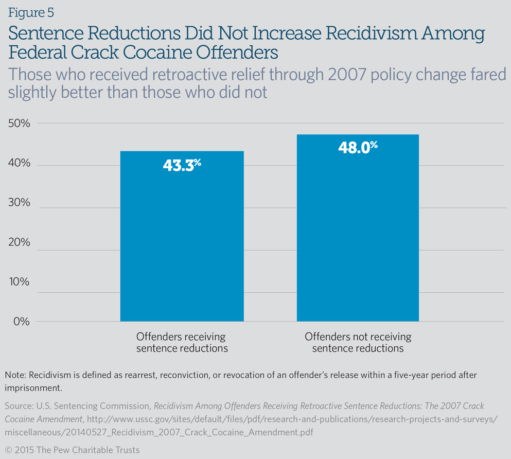 Conversely, targeted reductions in prison terms for certain federal drug offenders have not led to higher recidivism rates. In 2007, the Sentencing Commission retroactively reduced the sentences of thousands of crack cocaine offenders.38 A follow-up study on the effects of this change found no evidence of increased recidivism among offenders who received sentence reductions compared with those who did not.39 (See Figure 5.) In 2010, Congress followed the Sentencing Commission’s actions with a broader, statutory reduction in penalties for crack cocaine offenders.