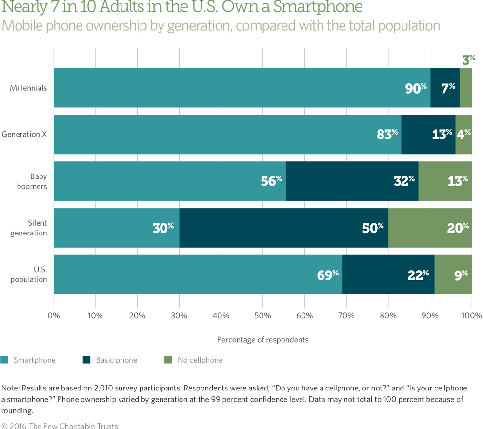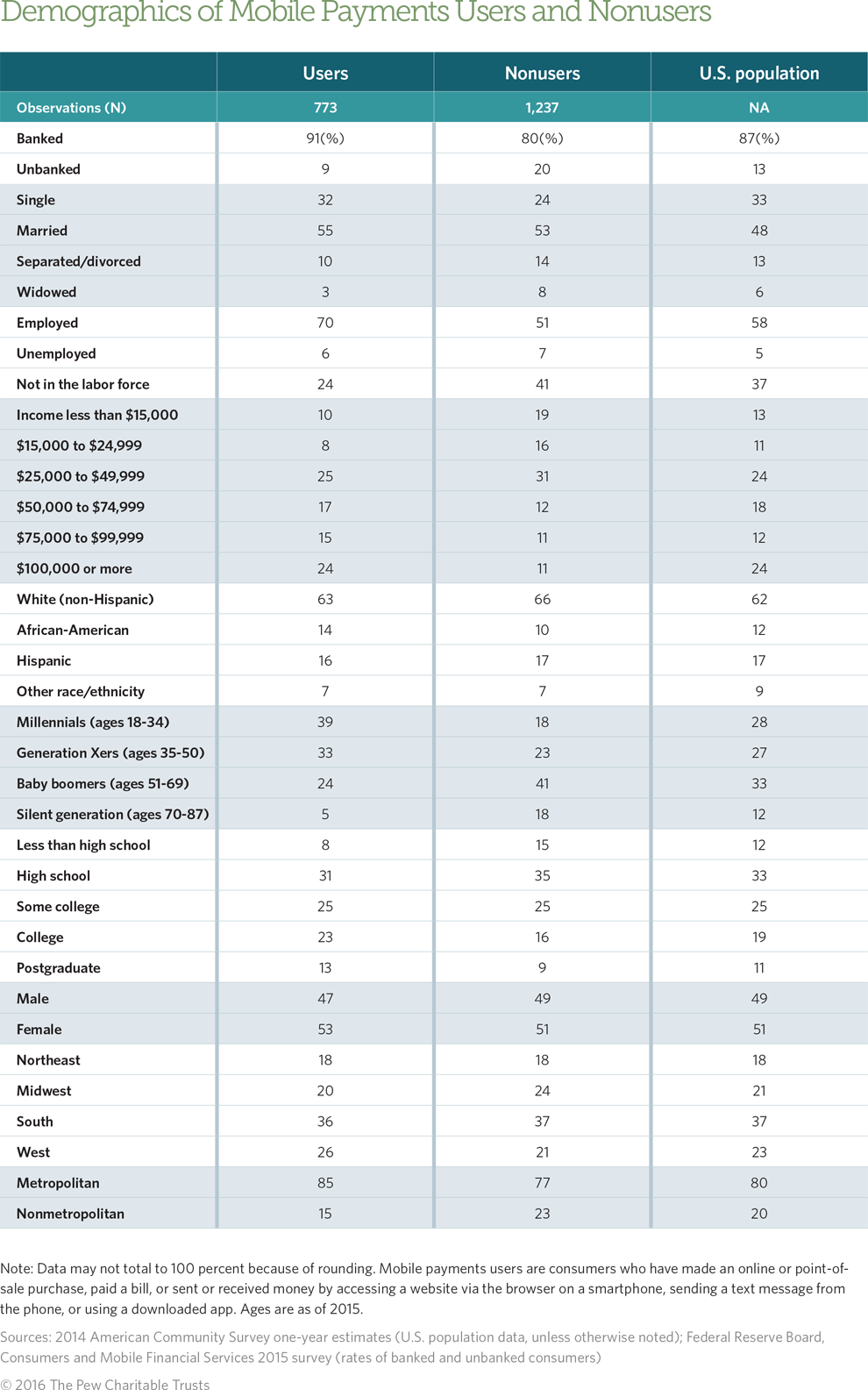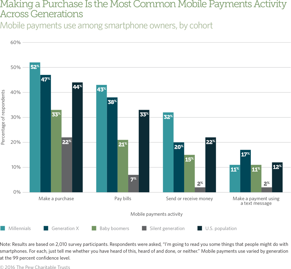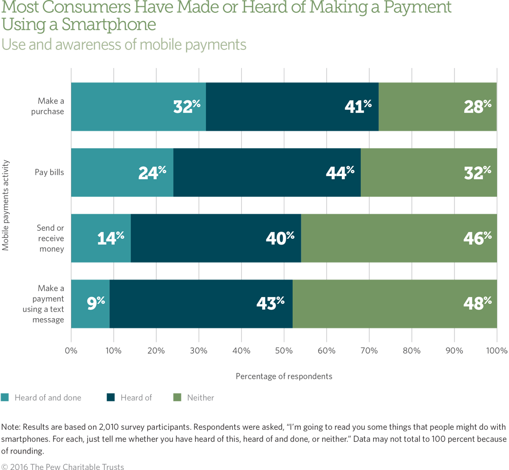 - Mobile banking—bill pay, funds transfers, and payments transacted on a smartphone via a bank’s website or app—is a widely used precursor to mobile payments; for more information, see The Pew Charitable Trusts, “Is This the Future of Banking? Focus Group Views on Mobile Payments” (January 2016), http://www.pewtrusts.org/~/media/assets/2016/01/ cb_futurebankingissuebrief.pdf.