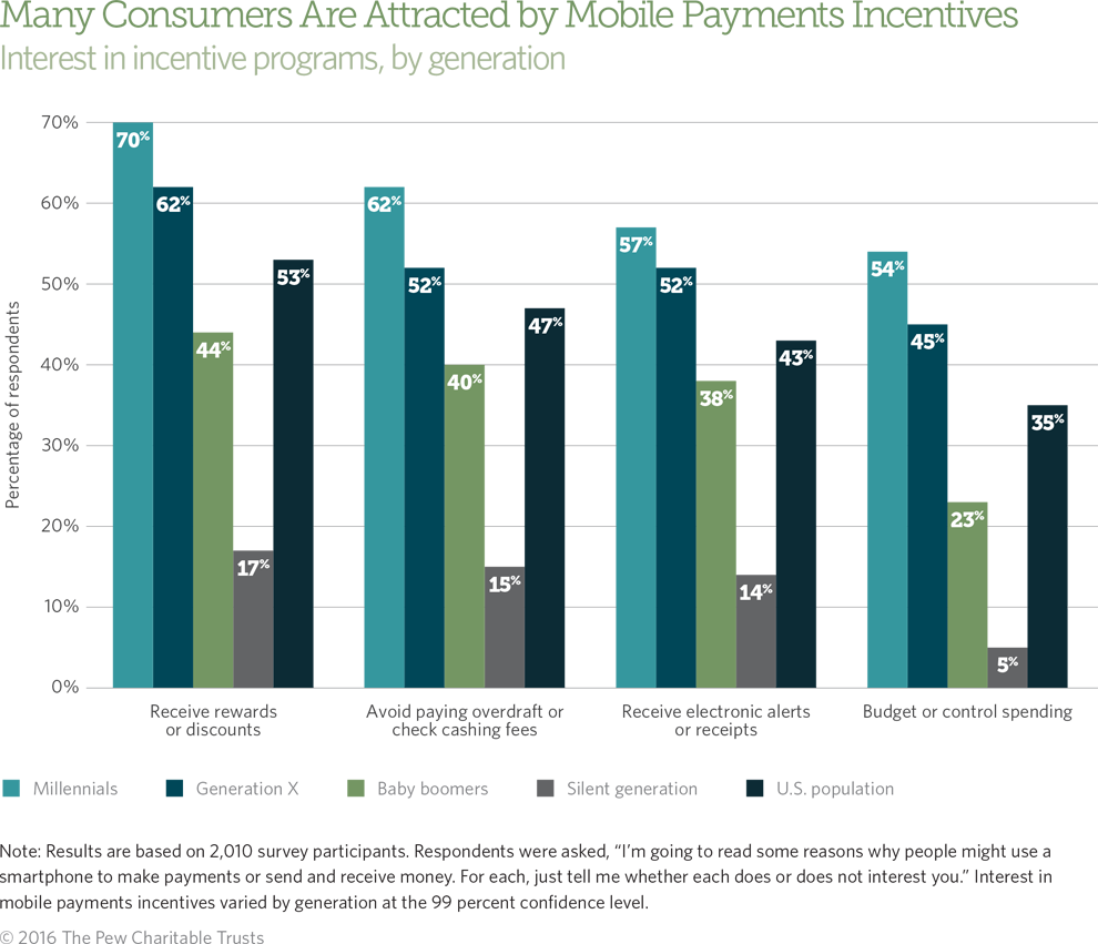 Millennials and Gen Xers in particular are motivated to use mobile payments in part because they like receiving rewards, discounts, alerts, and electronic receipts. Consumers are also interested in avoiding fees, such as overdraft or check cashing fees, and using their smartphones to help them budget. In fact, research shows that consumers are using smartphones to help with budgeting more than in previous years.6