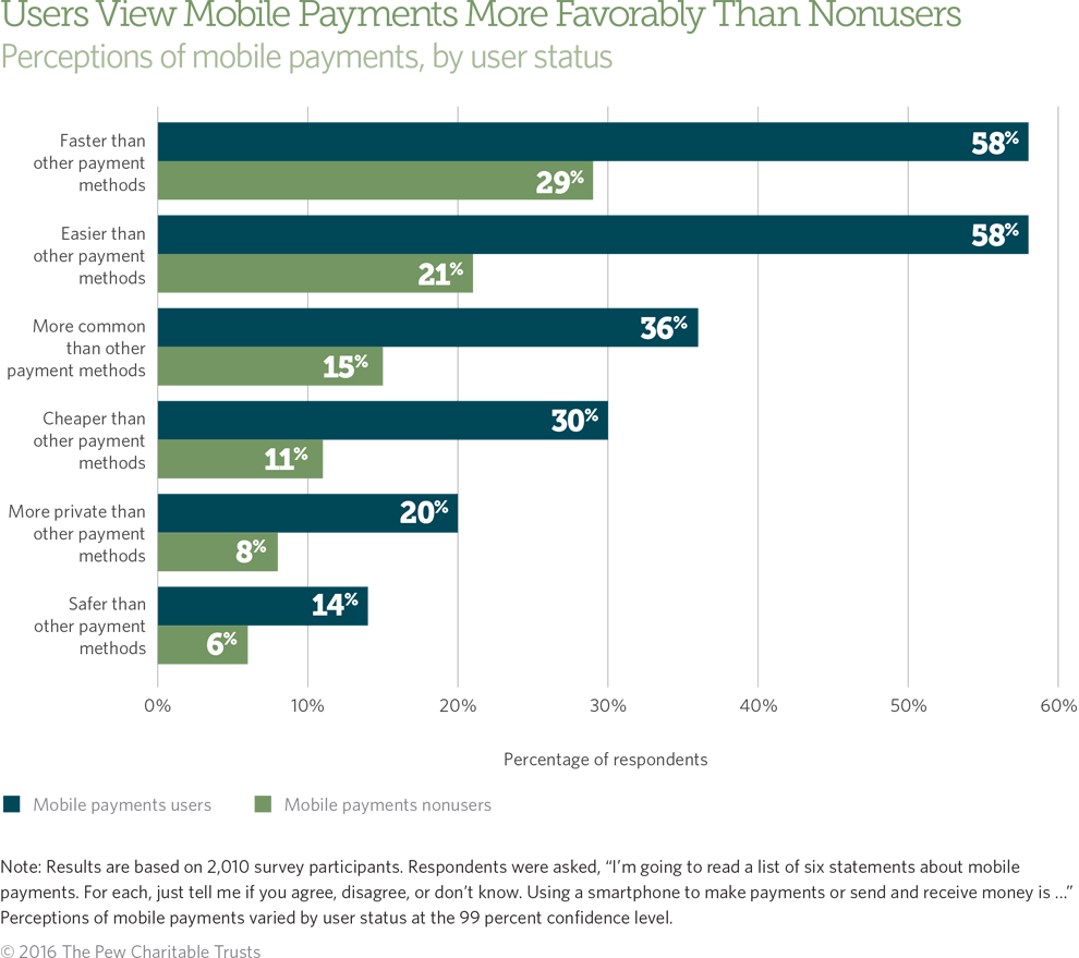 Mobile payments use is related to more favorable perceptions of the technology in terms of convenience, cost, privacy, and security. Users agree more often than nonusers that mobile payments are faster, easier, more common, cheaper, more private, and safer than other payment methods.