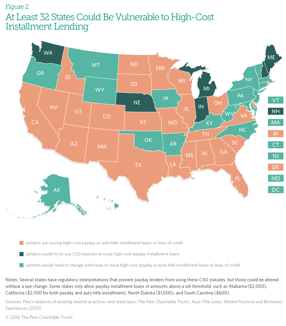 1. High-interest installment loans and lines of credit are issued by storefront payday lenders and state-licensed online payday lenders in 19 states: Alabama, California, Colorado, Delaware, Idaho, Illinois, Kansas, Missouri, New Mexico, North Dakota, Ohio, Rhode Island, South Carolina, South Dakota, Tennessee, Texas, Utah, Virginia, and Wisconsin. High-interest auto title installment loans are issued in 17 states, and lenders were allowed to start offering them in Mississippi as of July 1, 2016. In total, multipayment payday or auto title loans are available in 26 of the 39 states where payday and auto title lenders operate.