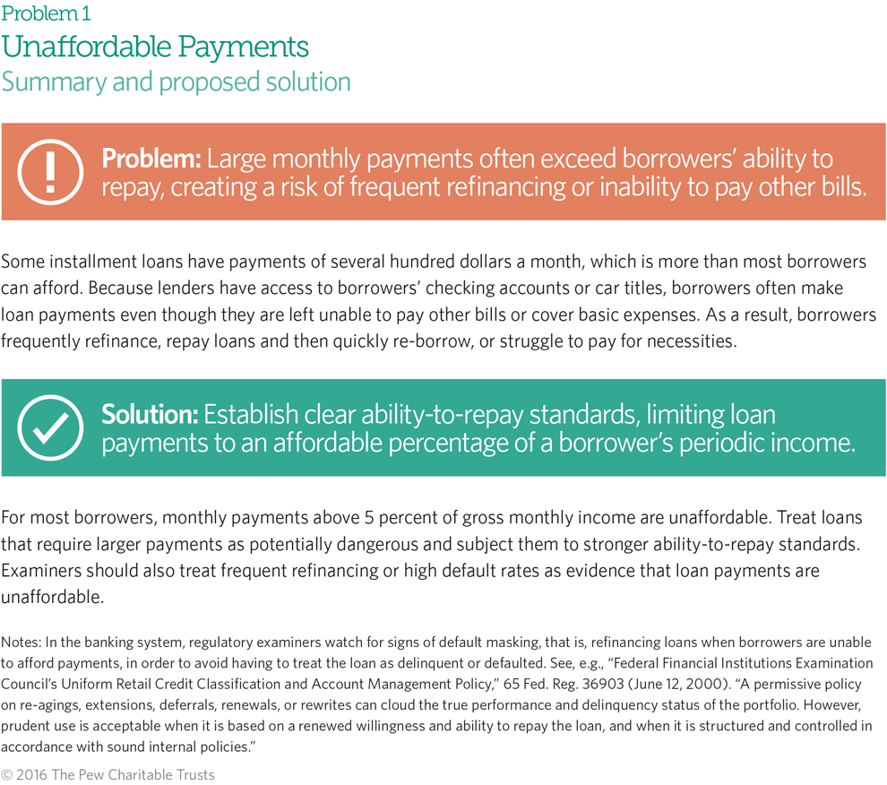 To solve the problem of unaffordable payments, policymakers should require loans to be repayable in small installments that are affordable for most borrowers. Research shows that in order to fit the budgets of typical payday loan borrowers, payments must not exceed 5 percent of monthly income.