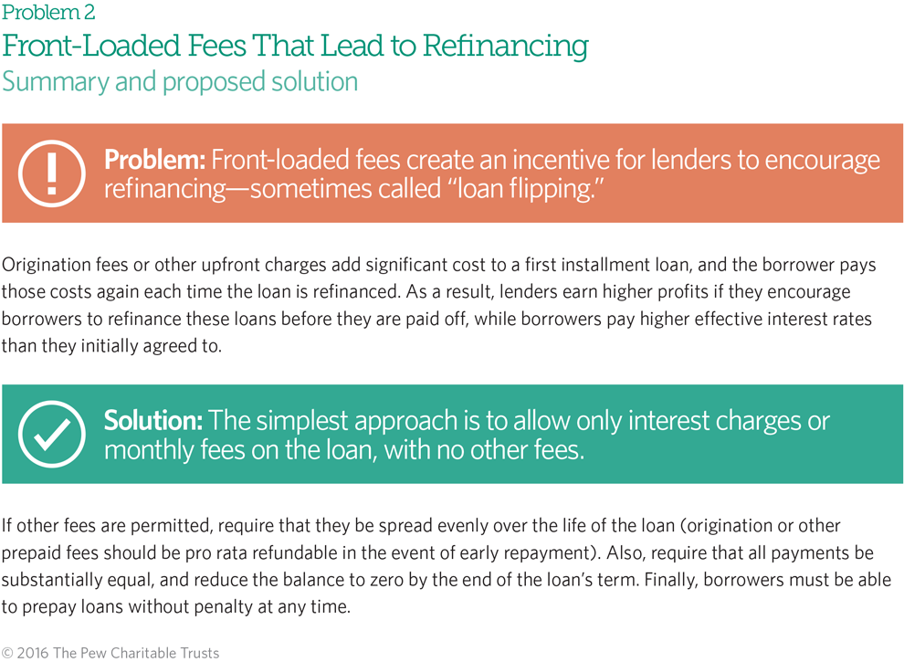 This brief describes practices that are unique to the payday installment loan market and others that exist primarily in the traditional subprime installment loan market, focusing on four that threaten the integrity of subprime small-dollar loan markets: unaffordable payments, frontloaded charges that add costs for borrowers who repay early or refinance, excessive durations, and unnecessarily high prices.9